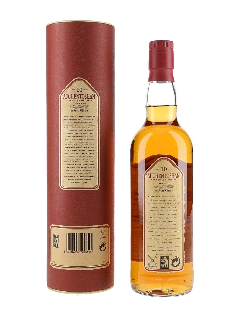 A bottle of Auchentoshan 10 Year Old Lowland Single Malt Scotch Whisky. We estimate this was bottled in the 1990s.