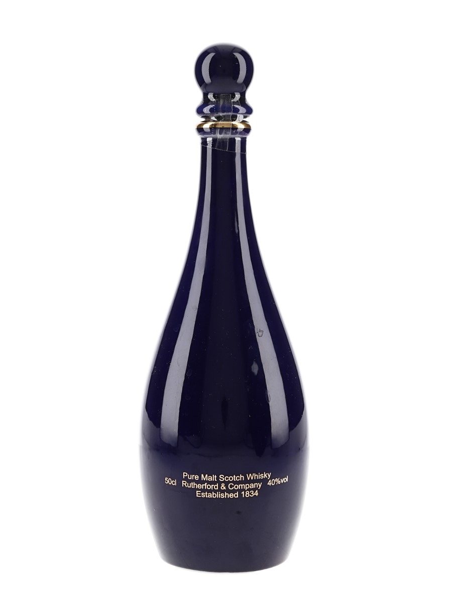 A 50cl blue ceramic Rutherford's decanter containing blended malt Scotch whisky decorated with The Black Watch regimental crest and motto; "Nemo Me impune lacessit".