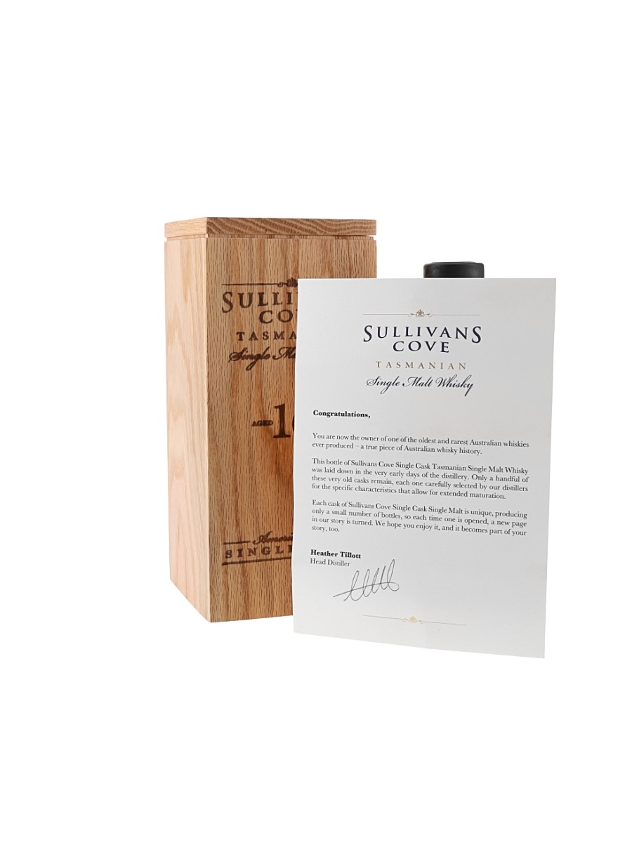 A bottle of Sullivans Cove 16 year old Tasmanian Single Malt Whisky. The whisky was filled into a single American oak cask on 18 October 2005 and bottled on 11 November 2021 at 48% ABV as part of the Old & Rare Collection.
