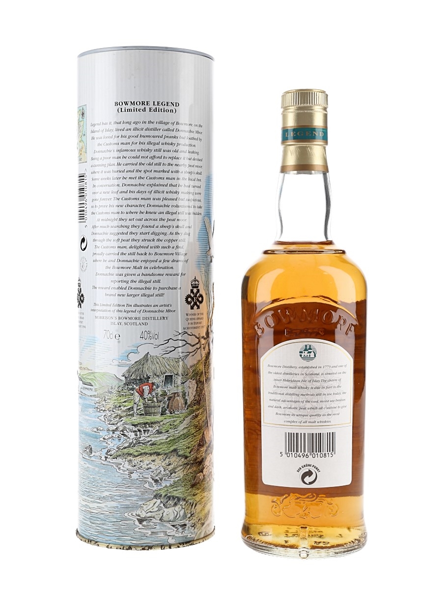 A bottle of Bowmore Legend, presented in a special tin featuring the story of the legend Of Donnachie Mhor.