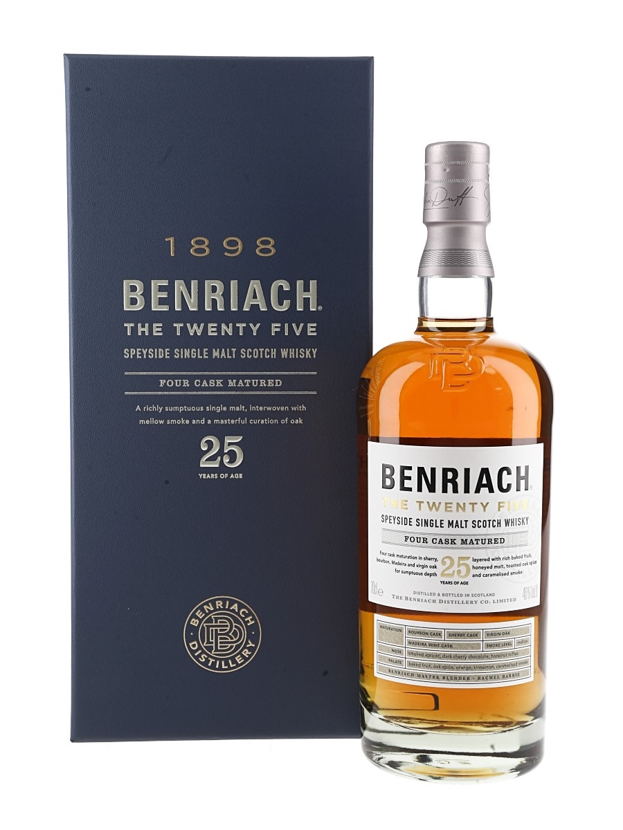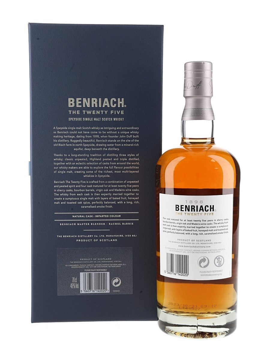 A bottle of Benriach 25 Year Old Single Malt Scotch Whisky. Matured in a marriage of Bourbon, Sherry, Virgin oak and Madeira Wine casks before being bottled on 31 October 2023.