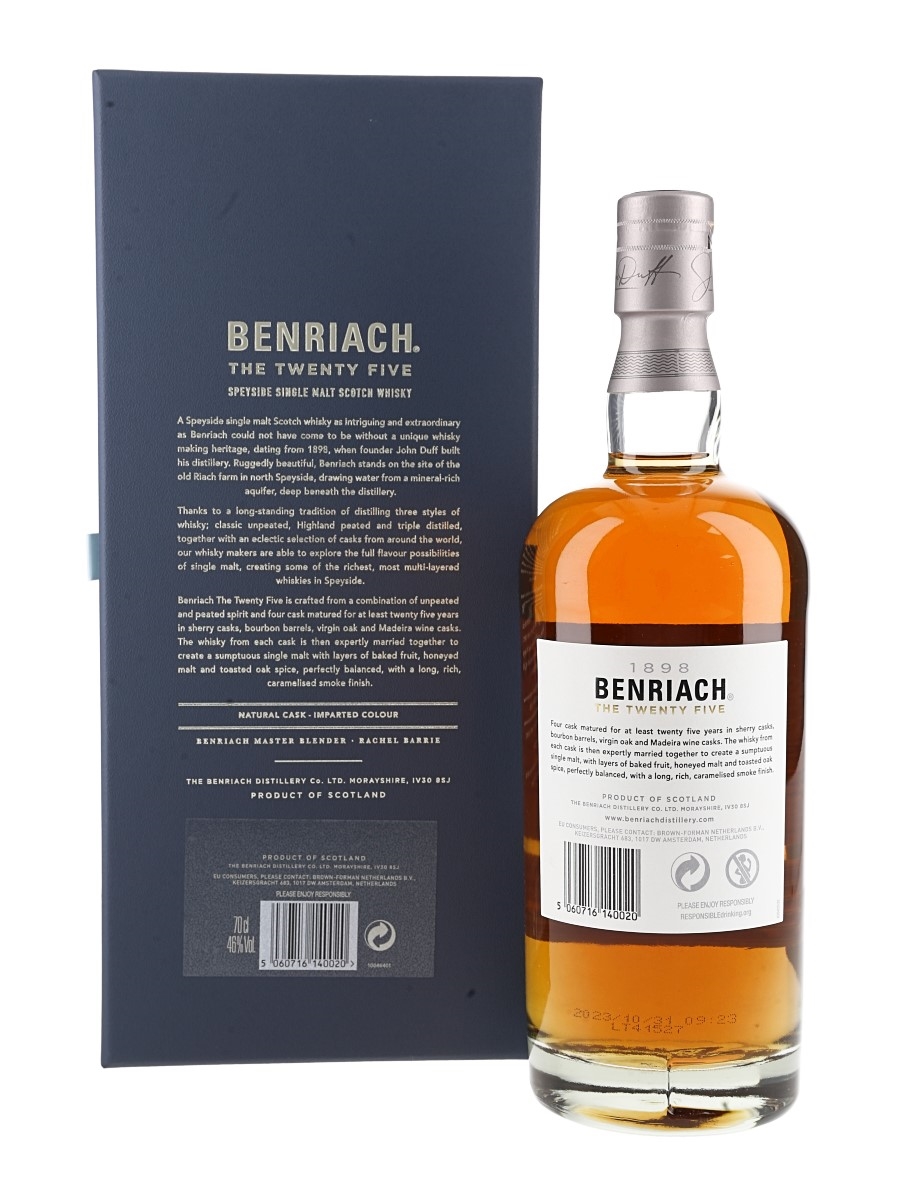 A bottle of Benriach 25 Year Old Single Malt Scotch Whisky. Matured in a marriage of Bourbon, Sherry, Virgin oak and Madeira Wine casks before being bottled on 31 October 2023.
