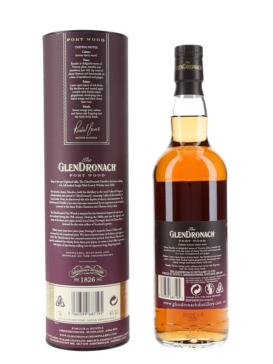A bottle of The Glendronach Port Wood Highland Single Malt Scotch Whisky, finished in port pipes from Portugal's Douro Valley.