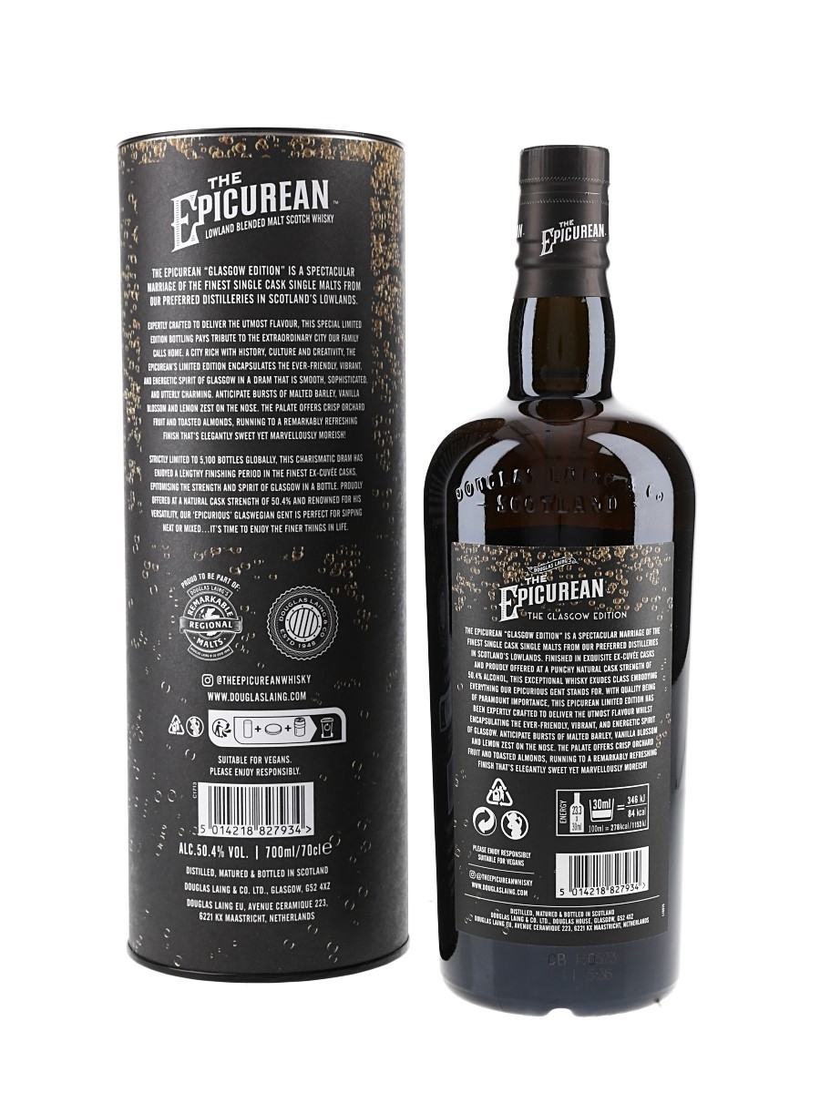 A limited edition bottle of The Epicurean Lowland Blended Malt Scotch Whisky. This Glasgow Edition was bottled at cask strength by Douglas Laing & Co.
