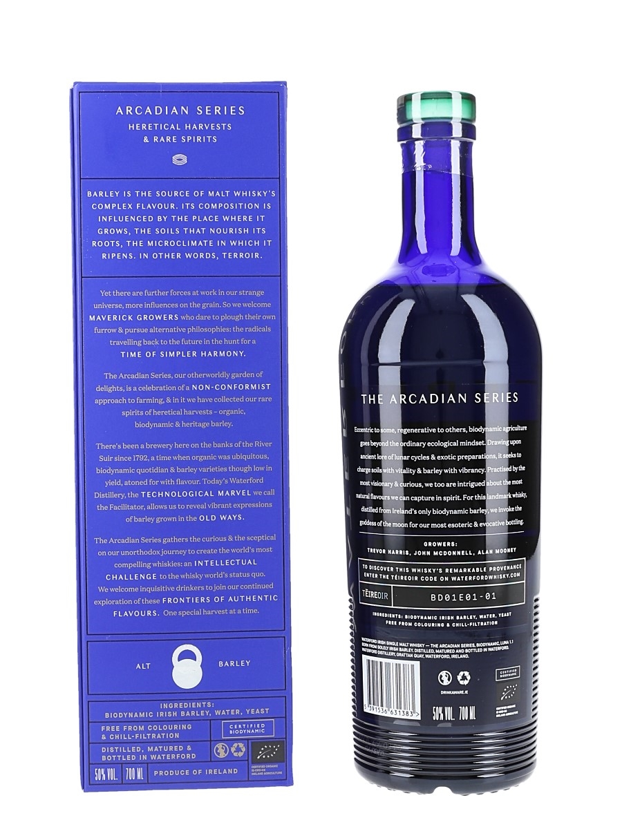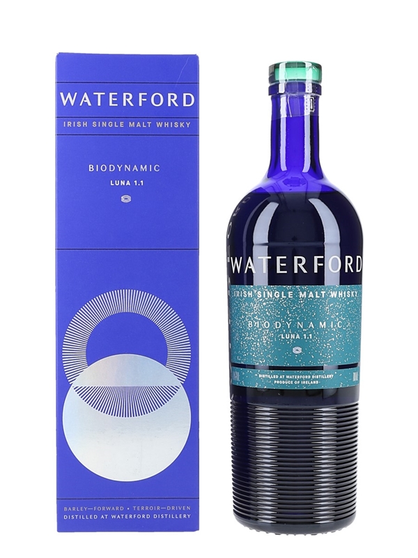 A bottle of Waterford Luna 1.1 Biodynamic Irish Single Malt Whisky, the world’s first whisky made from biodynamic barley. The barley for this whisky was harvested in summer 2017.This was distilled in 2018, matured for 3 years, 2 months, 1 day and bottled at 50% ABV on 4 September 2021 as part of the Arcadian Series.