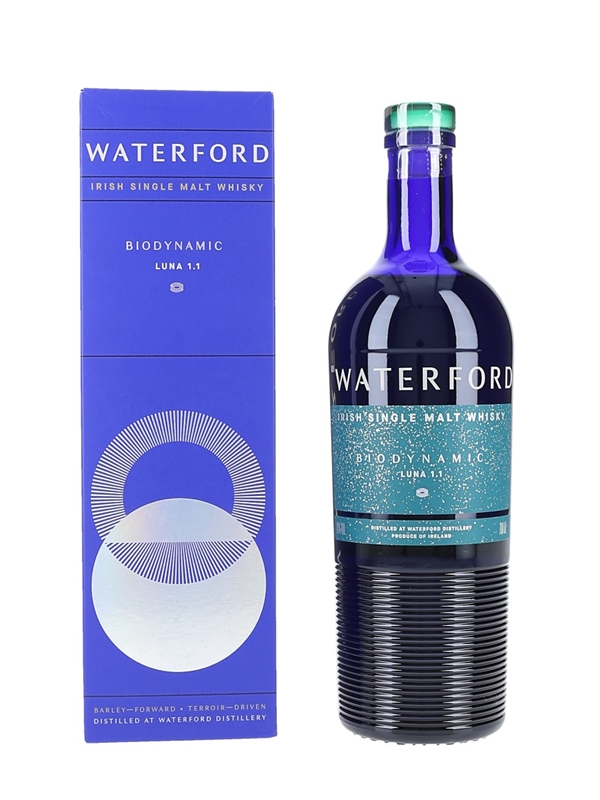 A bottle of Waterford Luna 1.1 Biodynamic Irish Single Malt Whisky, the world’s first whisky made from biodynamic barley. The barley for this whisky was harvested in summer 2017.This was distilled in 2018, matured for 3 years, 2 months, 1 day and bottled at 50% ABV on 4 September 2021 as part of the Arcadian Series.