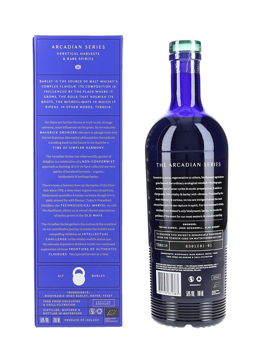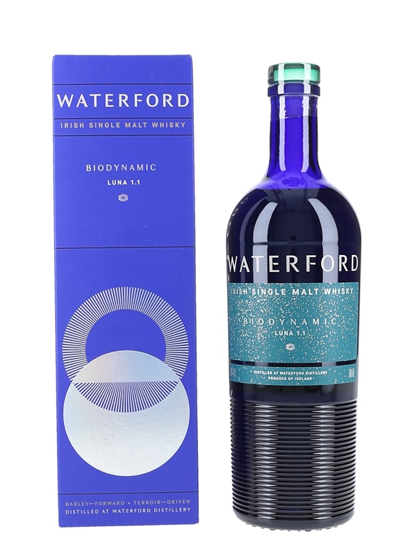 A bottle of Waterford Luna 1.1 Biodynamic Irish Single Malt Whisky, the world’s first whisky made from biodynamic barley. The barley for this whisky was harvested in summer 2017.This was distilled in 2018, matured for 3 years, 2 months, 1 day and bottled at 50% ABV on 4 September 2021 as part of the Arcadian Series.