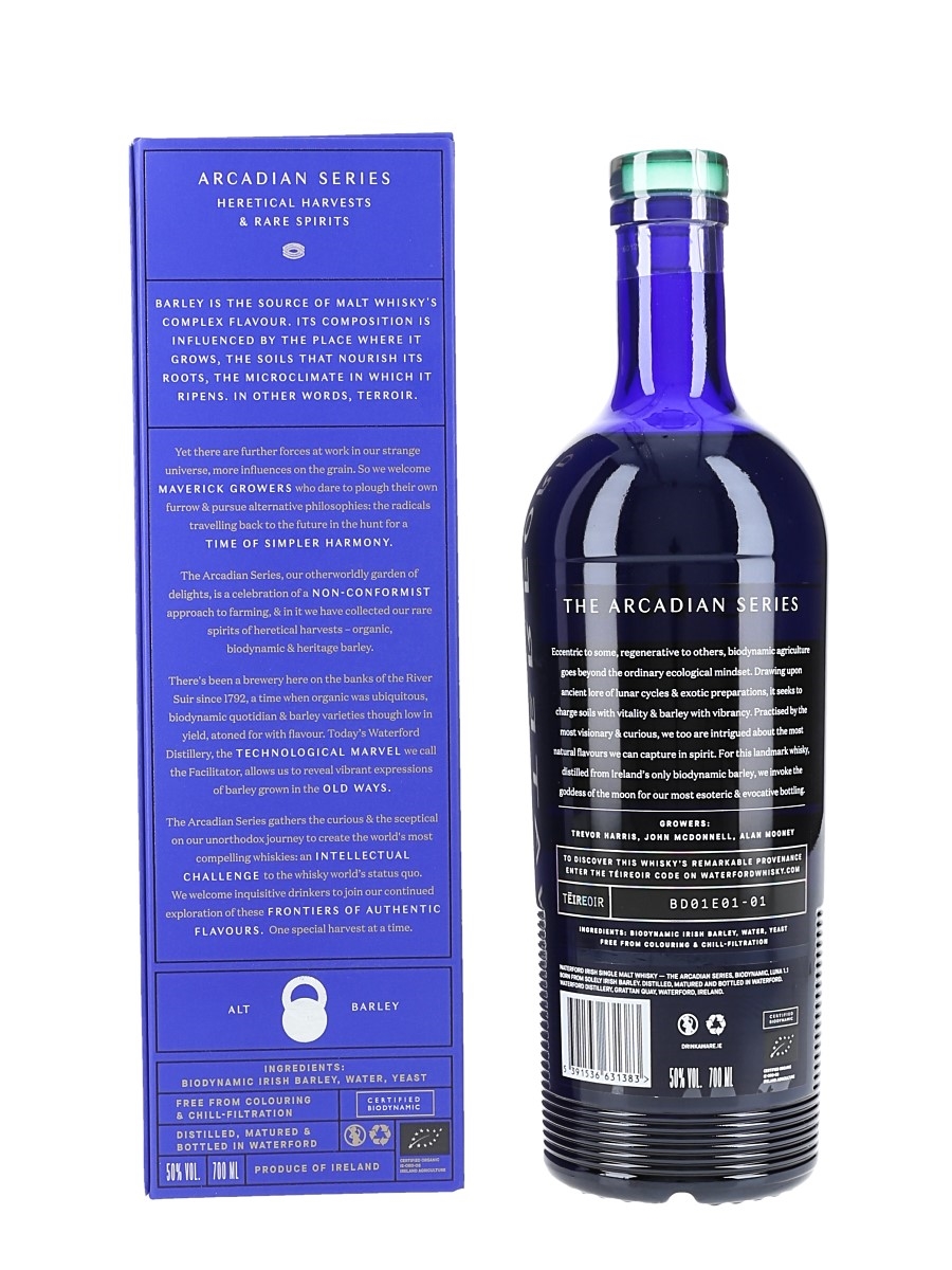 A bottle of Waterford Luna 1.1 Biodynamic Irish Single Malt Whisky, the world’s first whisky made from biodynamic barley. The barley for this whisky was harvested in summer 2017.This was distilled in 2018, matured for 3 years, 2 months, 1 day and bottled at 50% ABV on 4 September 2021 as part of the Arcadian Series.
