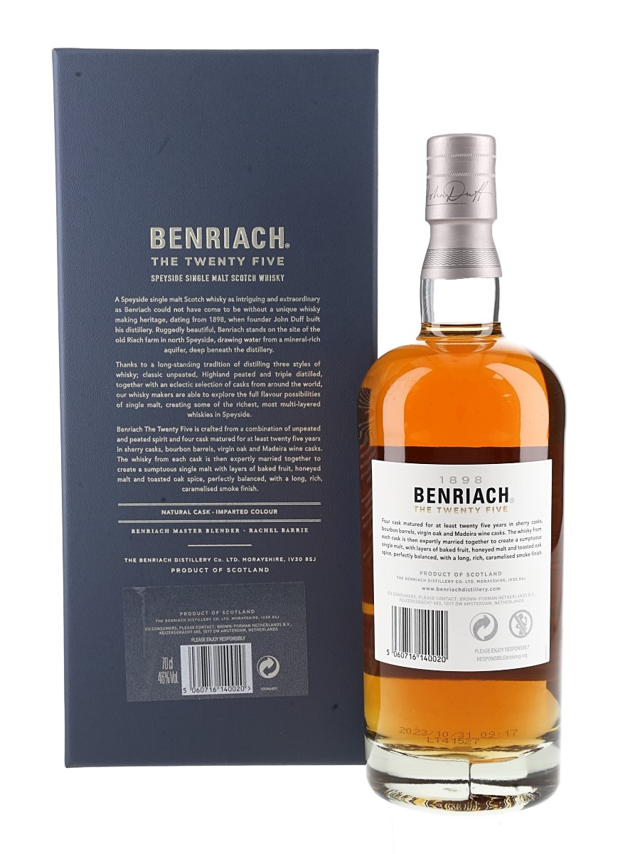 A bottle of Benriach 25 Year Old Single Malt Scotch Whisky. Matured in a marriage of Bourbon, Sherry, Virgin oak and Madeira Wine casks before being bottled on 31 October 2023.