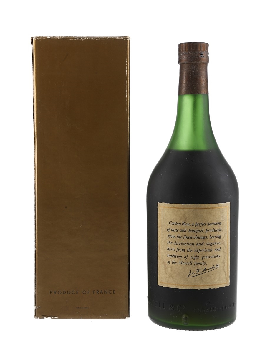 A 68cl bottle of Martell Cordon Bleu Cognac. This presentation was introduced in the late 1970s and was used until the early 1990s when the brand returned to it's iconic white label. We estimate this was bottled in the late 1970s.