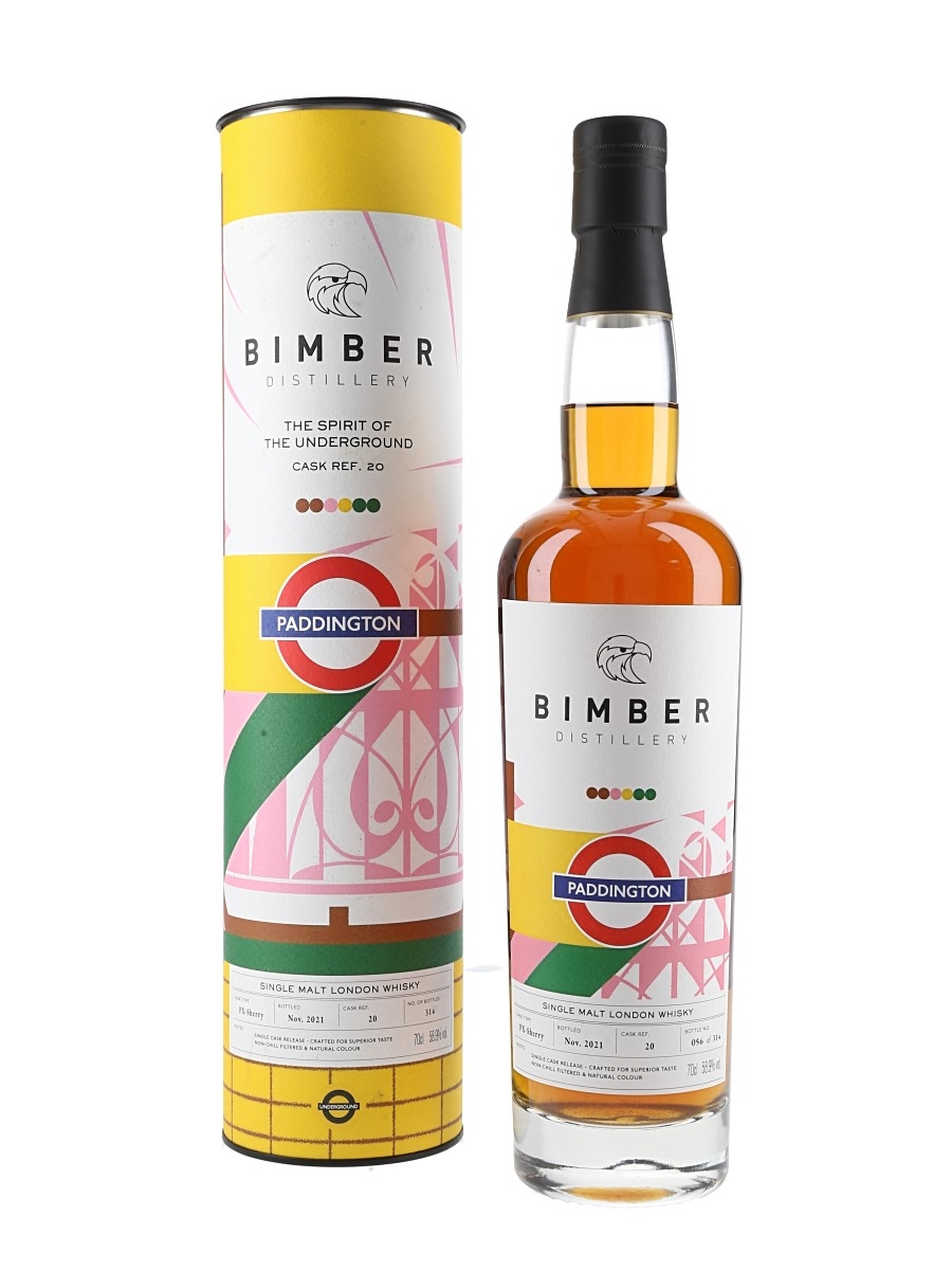 A bottle of Bimber Single Malt London Whisky This was matured in a PX sherry cask and bottled in November 2021 as the Paddington edition in The Spirit of the Underground series.