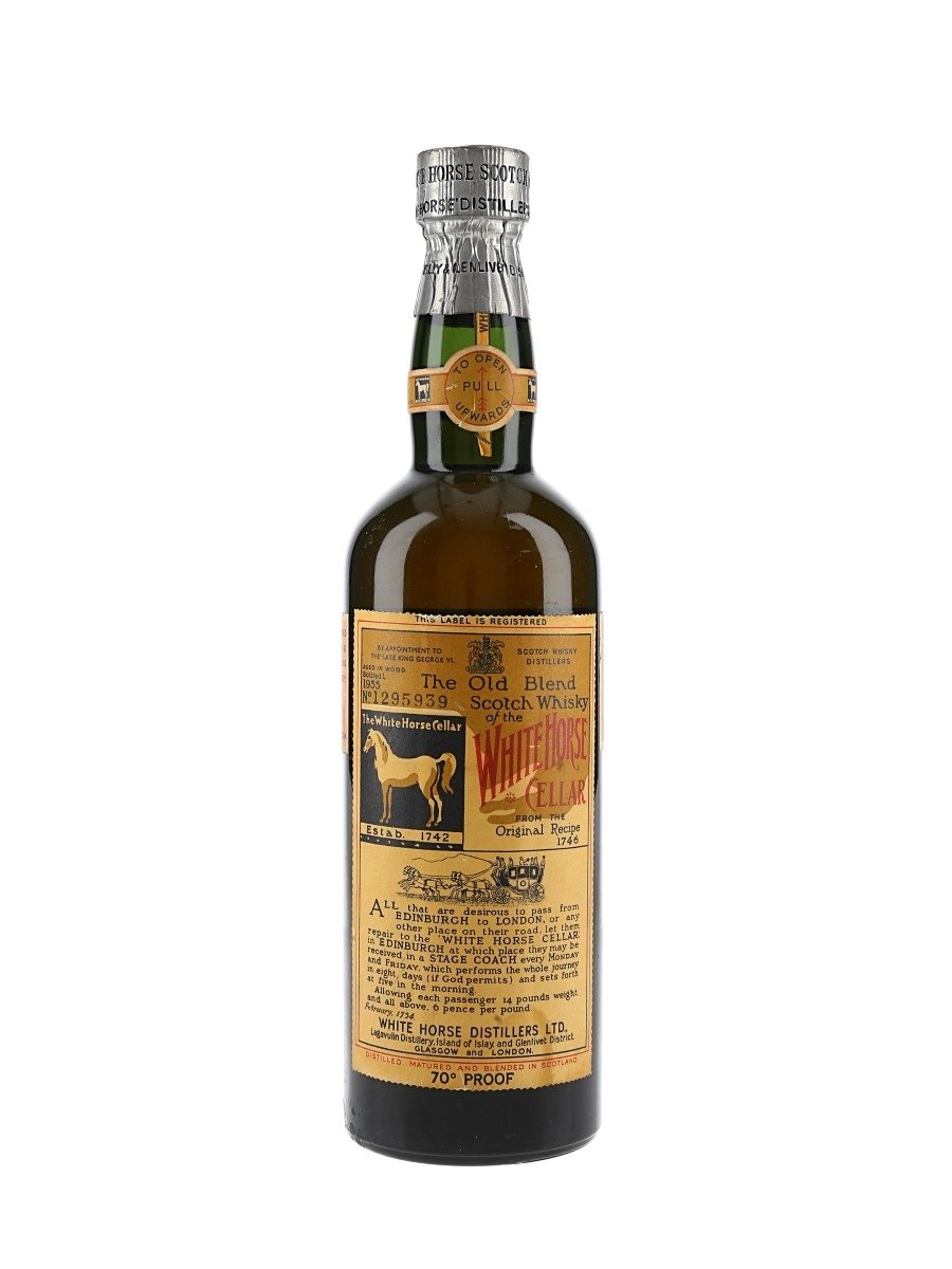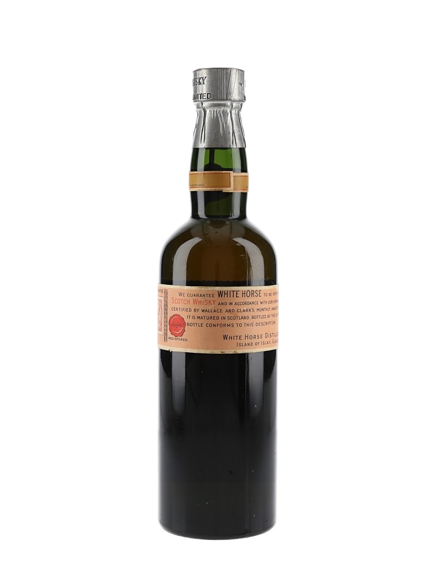 A bottle of White Horse Scotch Whisky distilled, blended and bottled in 1955 by White Horse Distillers Ltd, Scotland.