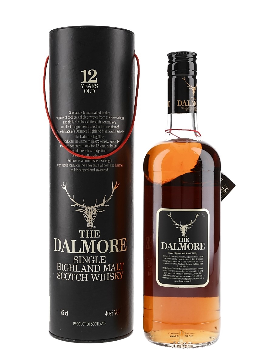 A bottle of Dalmore 12 Year Old Single Highland Malt Scotch Whisky. This was distilled, aged and bottled in Scotland by Whyte & Mackay Distillers Ltd., we estimate in the 1980s.