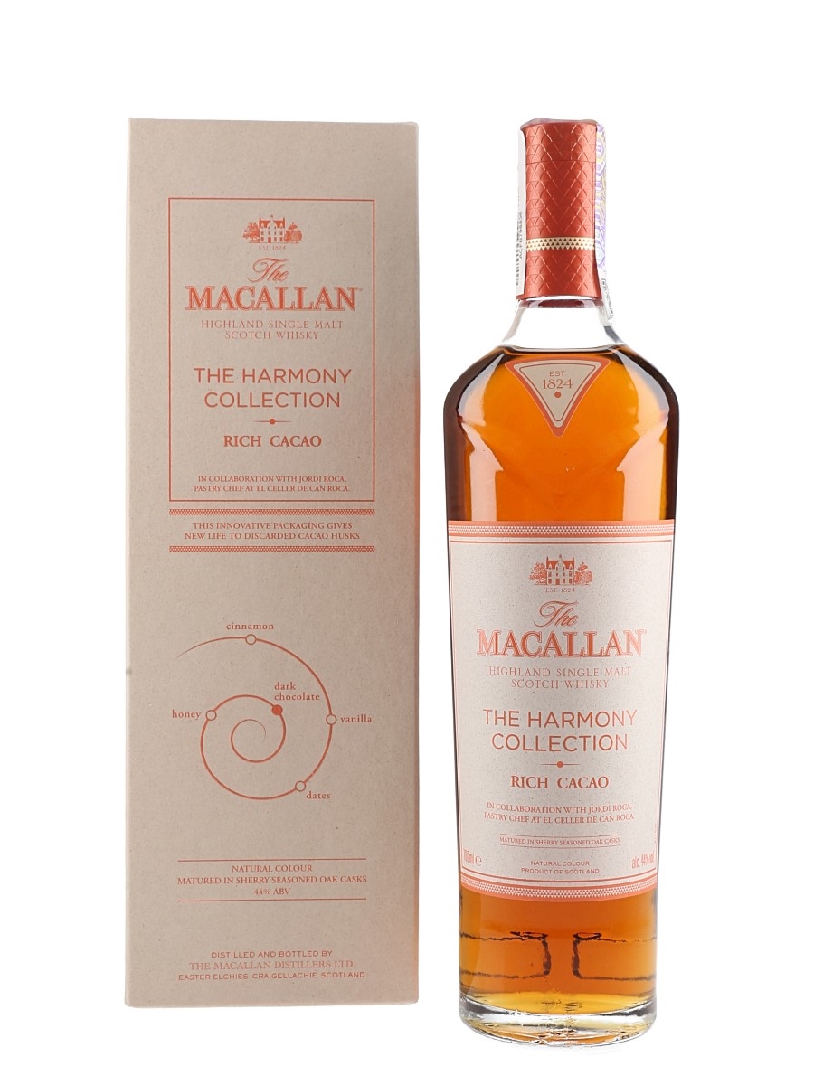 A bottle of The Macallan Rich Cacao Highland Single Malt Scotch Whisky from The Harmony Collection. This is inspired by the chocolate creations of Spanish chef Jordi Roca, pastry chef at El Celler de Can Roca. The restaurant was twice voted best restaurant in the world.