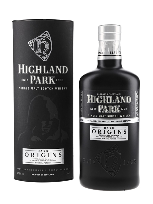 A bottle of Highland Park Dark Origins Single Malt Scotch Whisky, a sherried expression which was matured in 80% first-fill sherry casks and 20% refill casks.