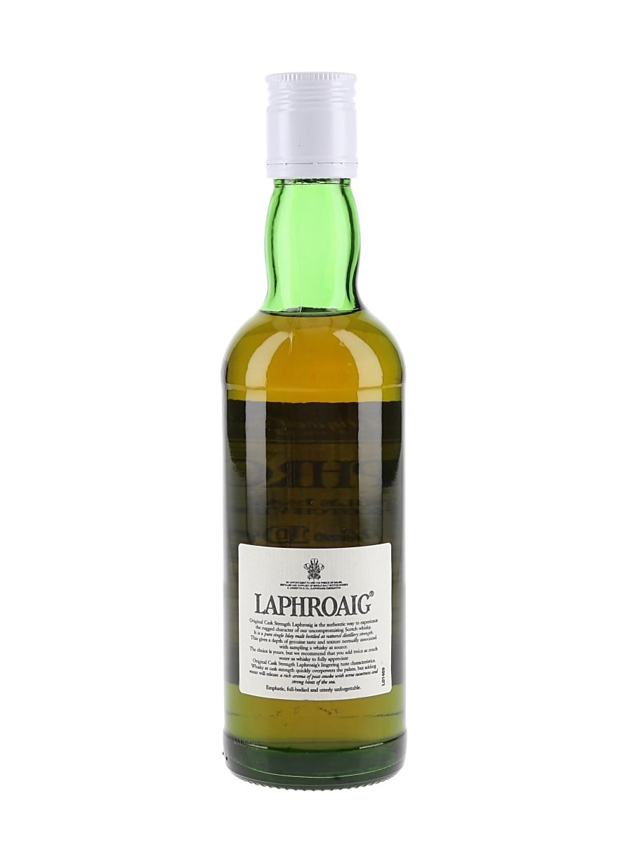 A half bottle of Laphroaig 10 Year Old Original Cask Strength Single Malt Scotch Whisky. We estimate this was bottled in the 2000s.