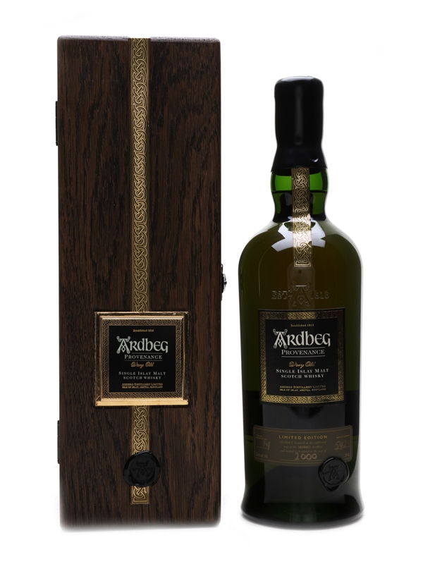 A limited edition bottle of Ardbeg 1974 Provenance, considered to be the last vintage of old style whisky from the distillery, from the final years that the floor maltings were in full use. Presented in a wooden box with a tartan wrap for the bottle.