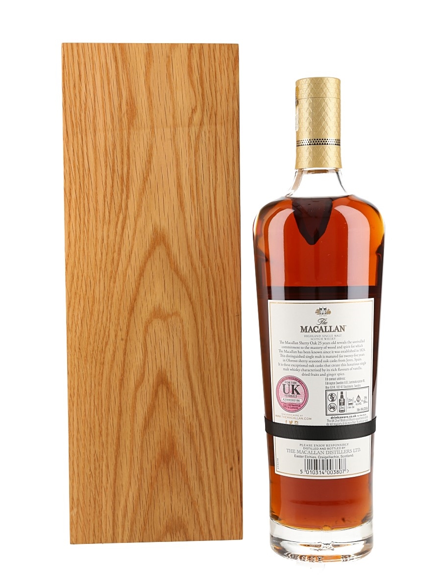 A bottle of The Macallan 25 Year Old Highland Single Malt Scotch Whisky. This was matured exclusively in sherry seasoned oak casks and bottled for the annual release in 2021.