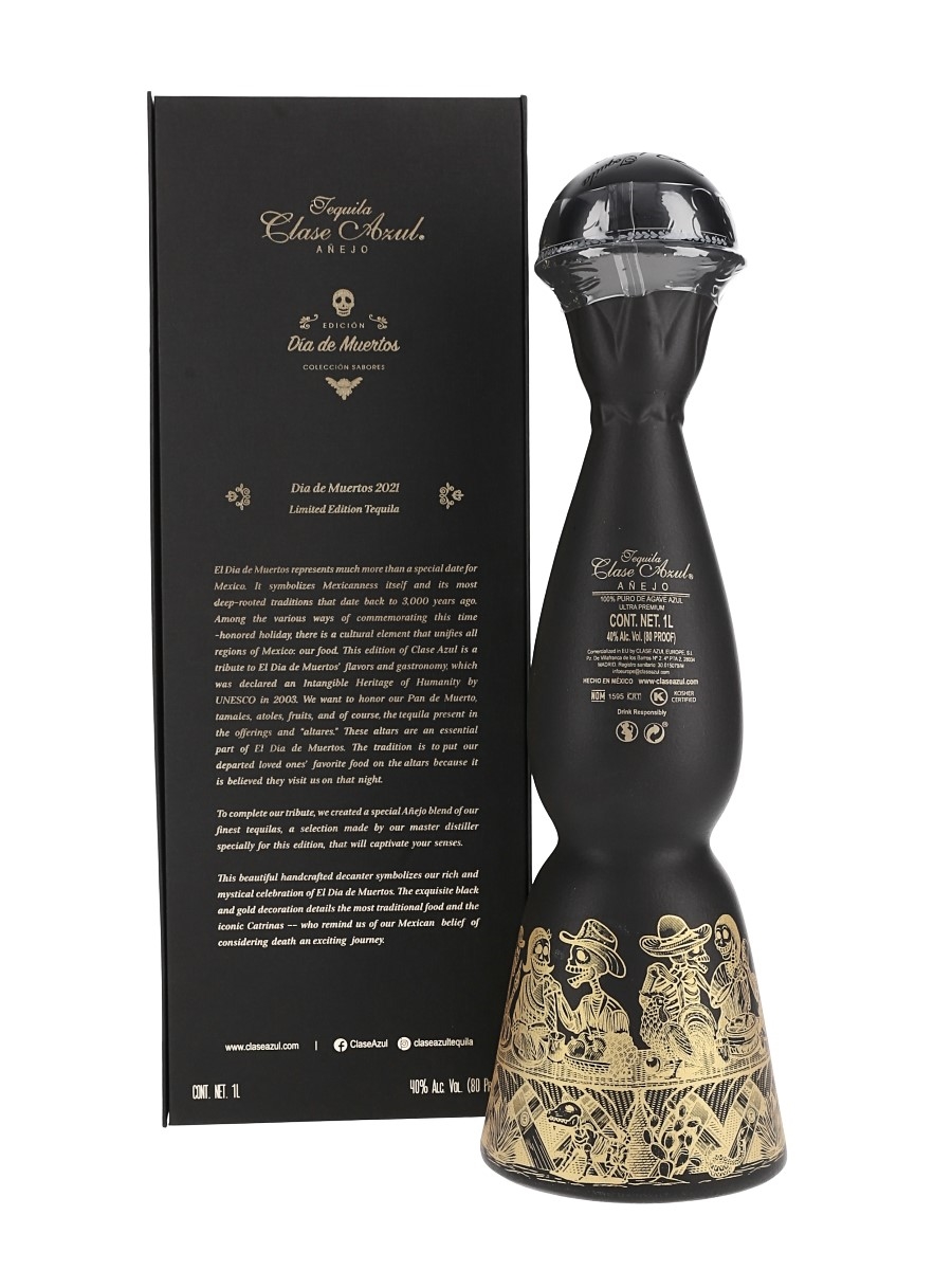 A litre bottle of Clase Azul Dia De Muertos Sabores Añejo Tequila from Mexico. This edition release was created by blending an añejo tequila aged for more than 14 months in casks previously used for American whiskey with tequilas aged in first-use American oak casks having light and medium charring. This limited edition was released to celebrate Dia de Muertos 2021 (Day of Dead 2021).