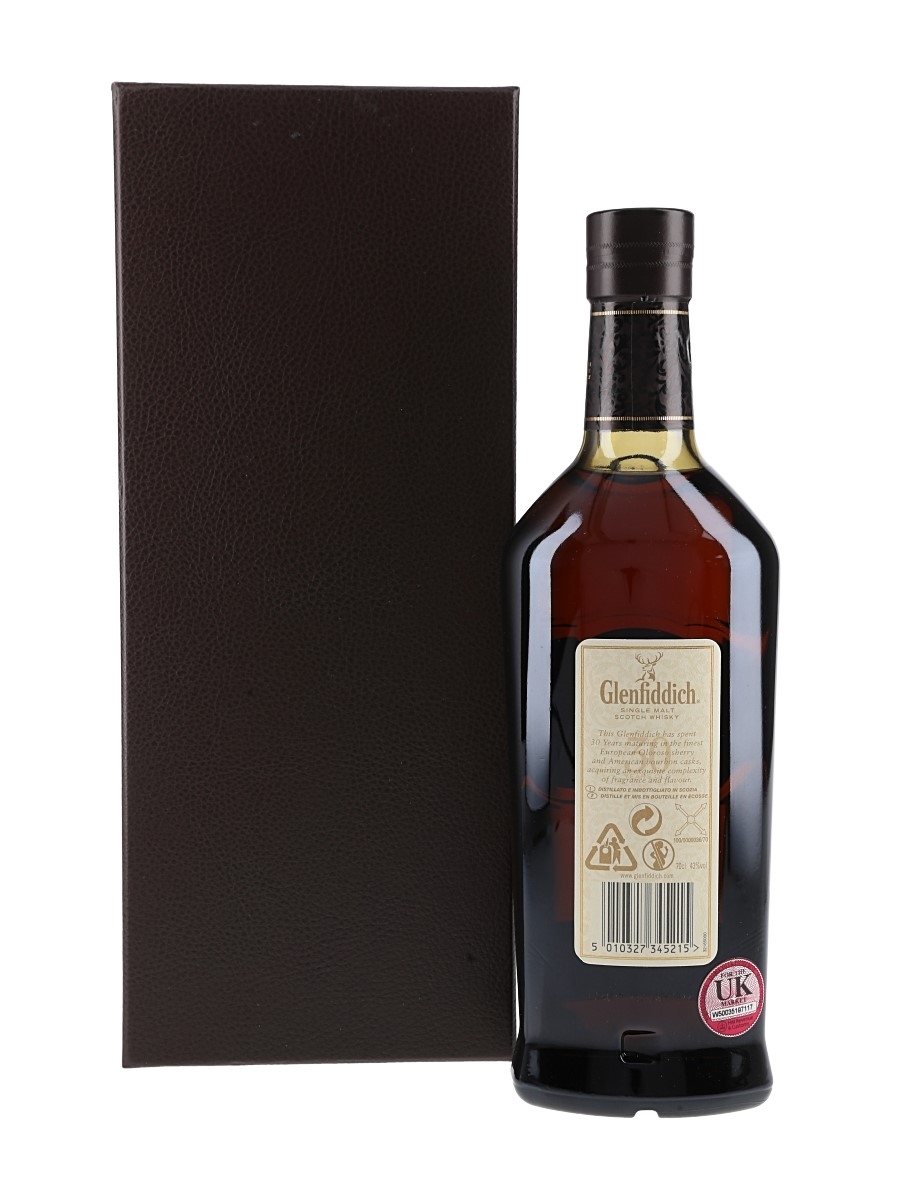 A bottle of Glenfiddich 30 Year Old, matured in a combination of European oloroso sherry and American bourbon casks. Each cask used in the production of this whisky was selected by Glenfiddich's Malt Master, Brian Kinsman.