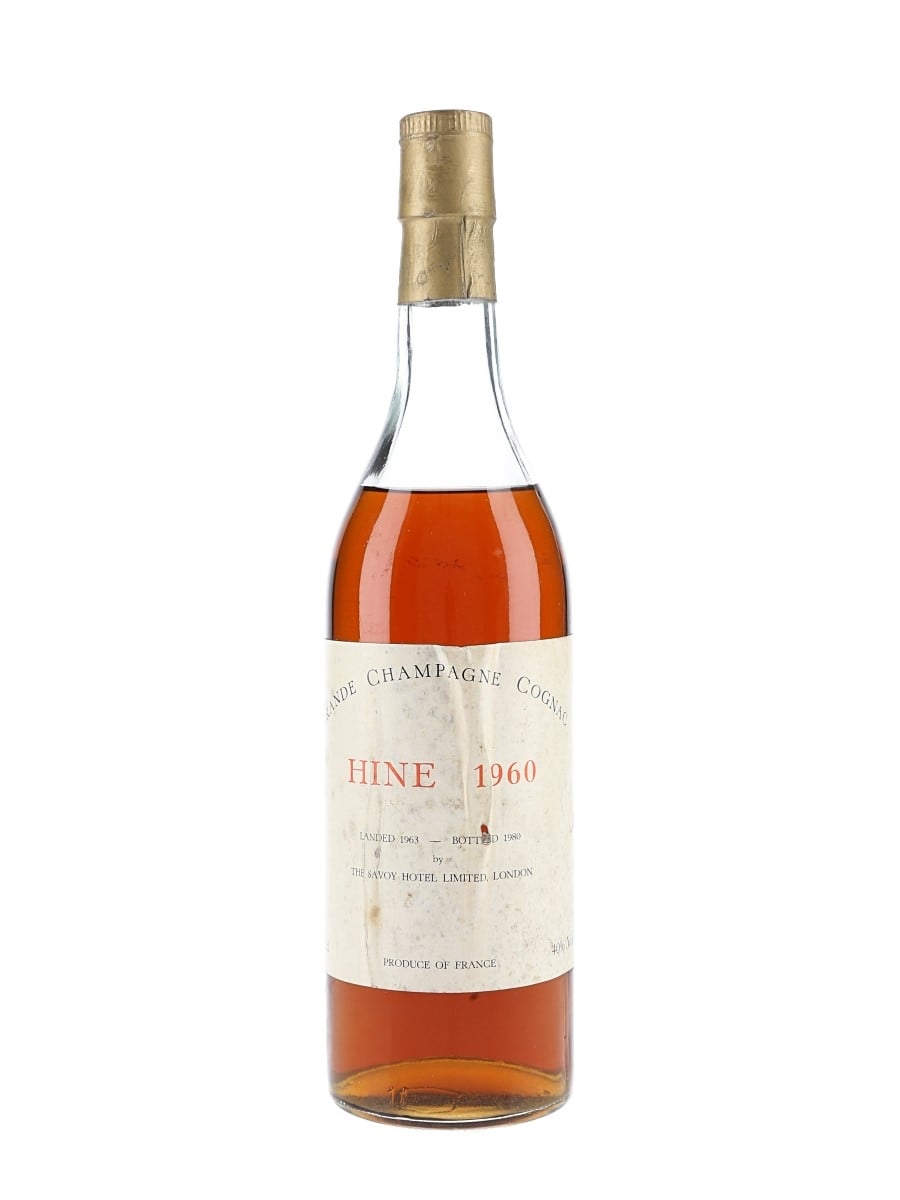 A 68.2cl bottle of Hine Grande Champagne Cognac. This was distilled in 1960, landed in the UK in 1963 and bottled in 1980 for The Savoy Hotel Limited, London.