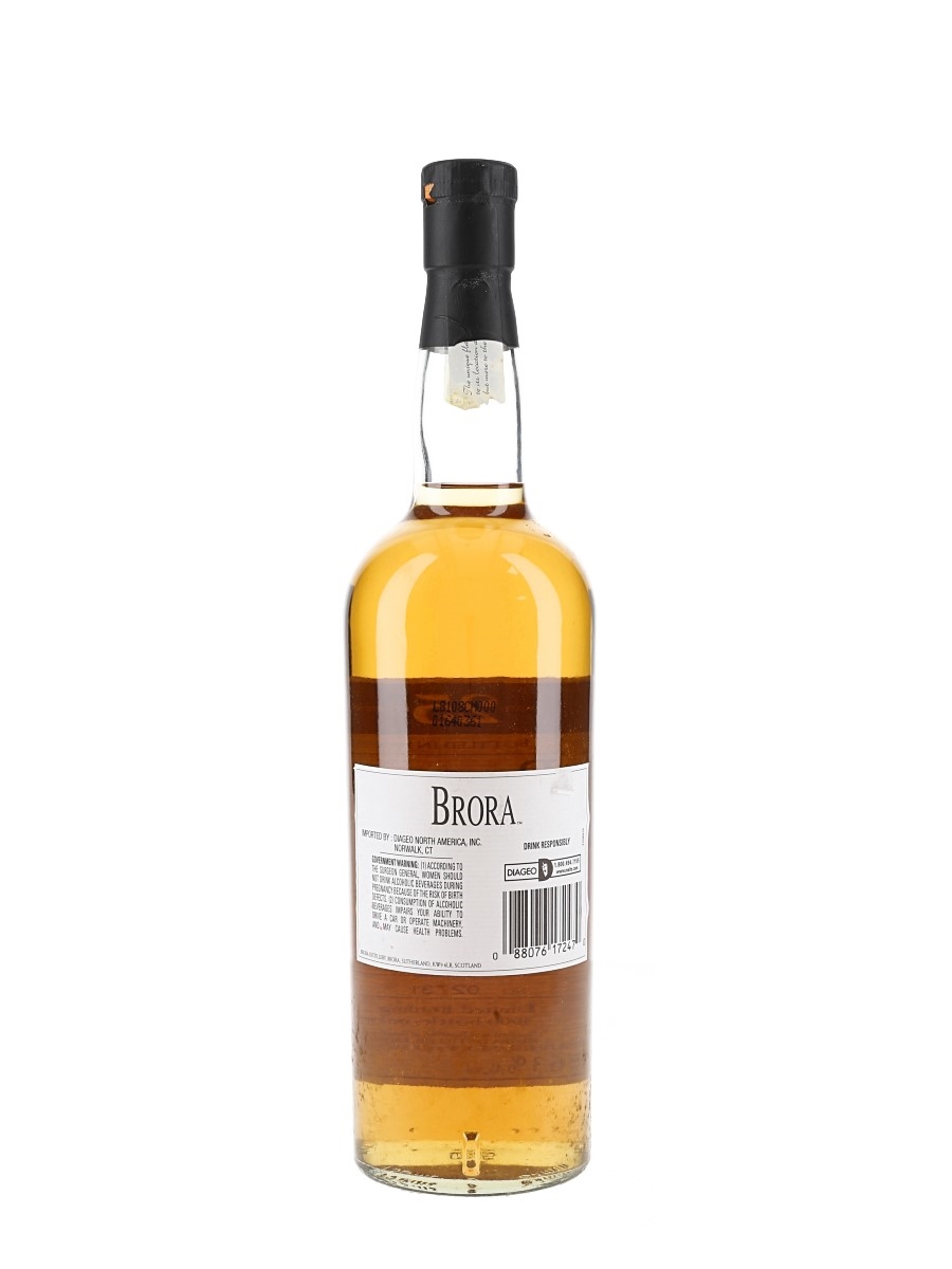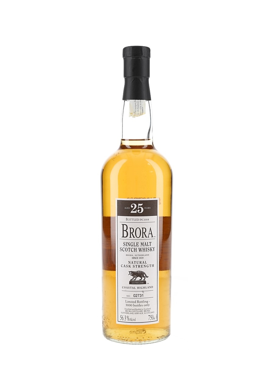 A bottle of Brora 25 Year Old Single Malt Scotch Whisky. This is the seventh release in Diageo's series of Brora 25 Year Old, bottled in 2008 at a natural cask strength of 56.3% ABV, and imported by Diageo to the US.