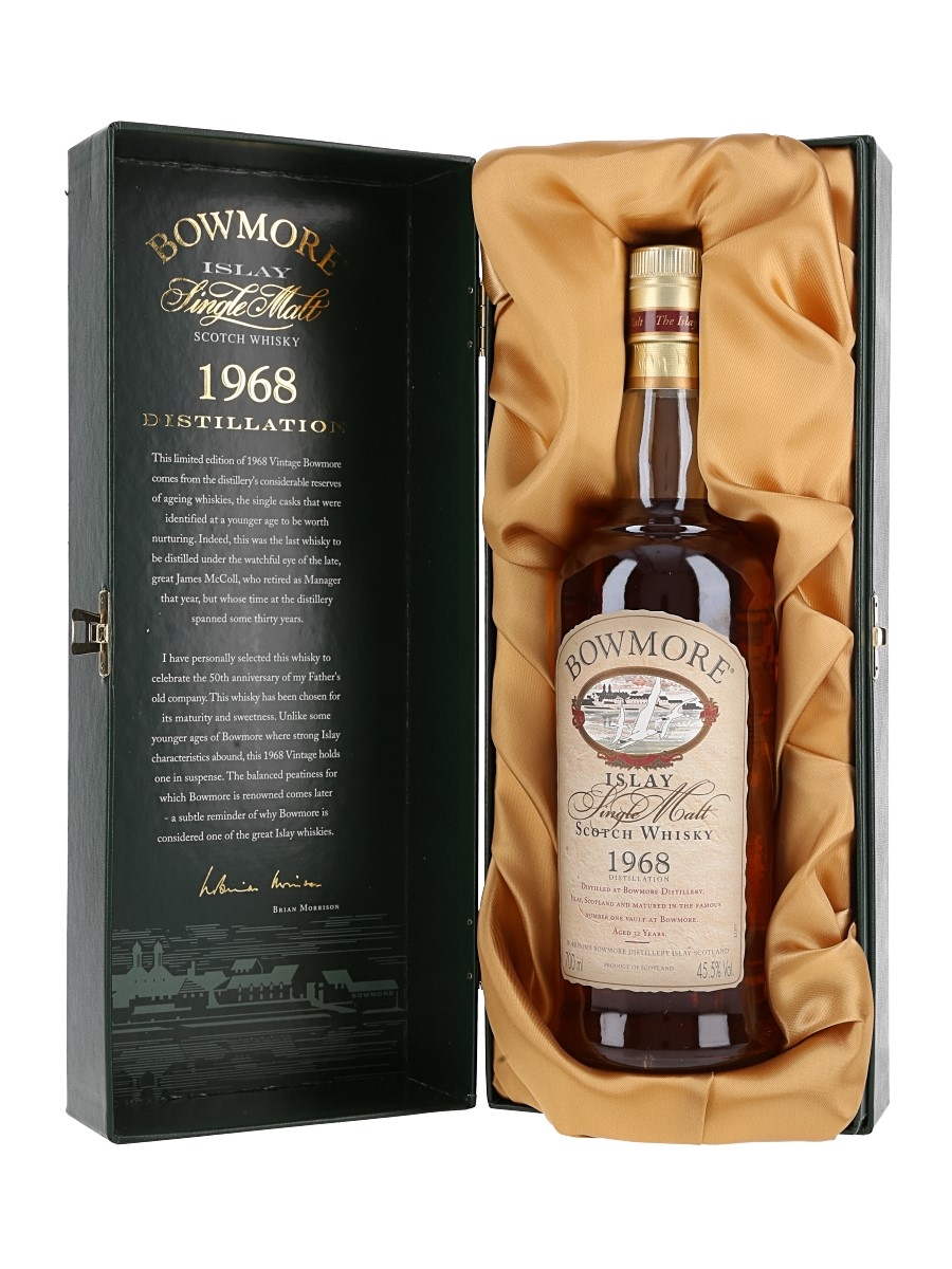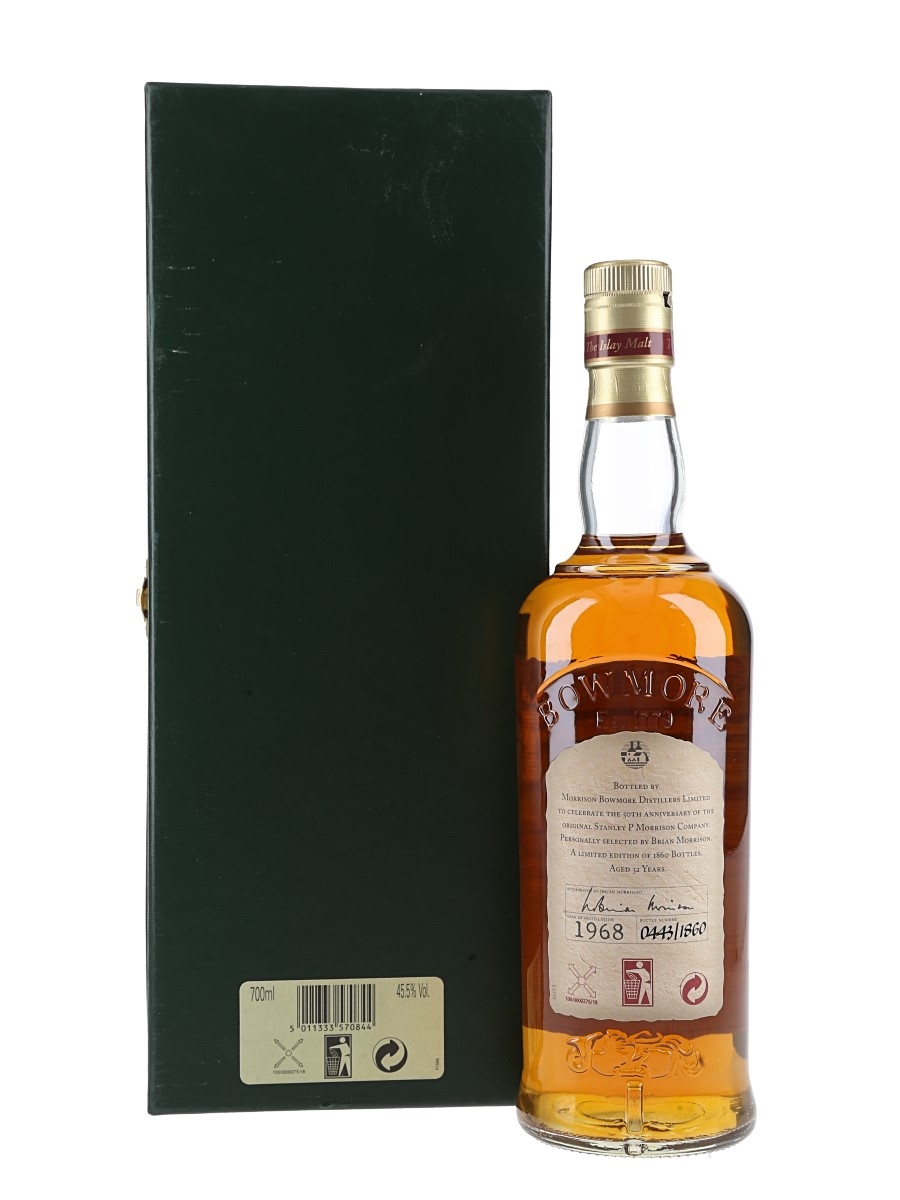 A bottle of Bowmore 32 Year Old Islay Single Malt Scotch Whisky. This was distilled in 1968 and bottled to celebrate the 50th anniversary of the original Stanley P Morrison Company, owners of Bowmore distillery since 1963. This was personally selected by Brian Morrison, son of Stanley.