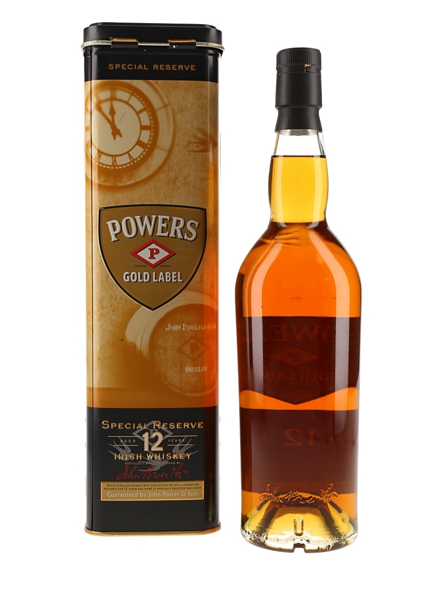 A bottle of Powers 12 Year Old Gold Label Irish whiskey, distilled and bottled in bond by John Power & Son.