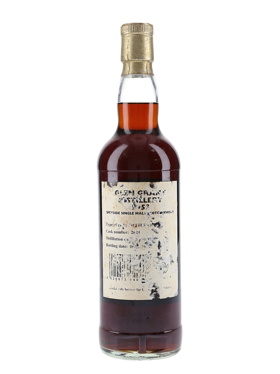 A bottle of Glen Grant 58 Year Old Single Malt Scotch Whisky. This was distilled on 1 September 1953, matured in a first fill sherry hogshead and bottled on 9 August 2012 for La Maison du Whisky by independent bottler Gordon & MacPhail. The label is adapted from the ancient Book of Kells.