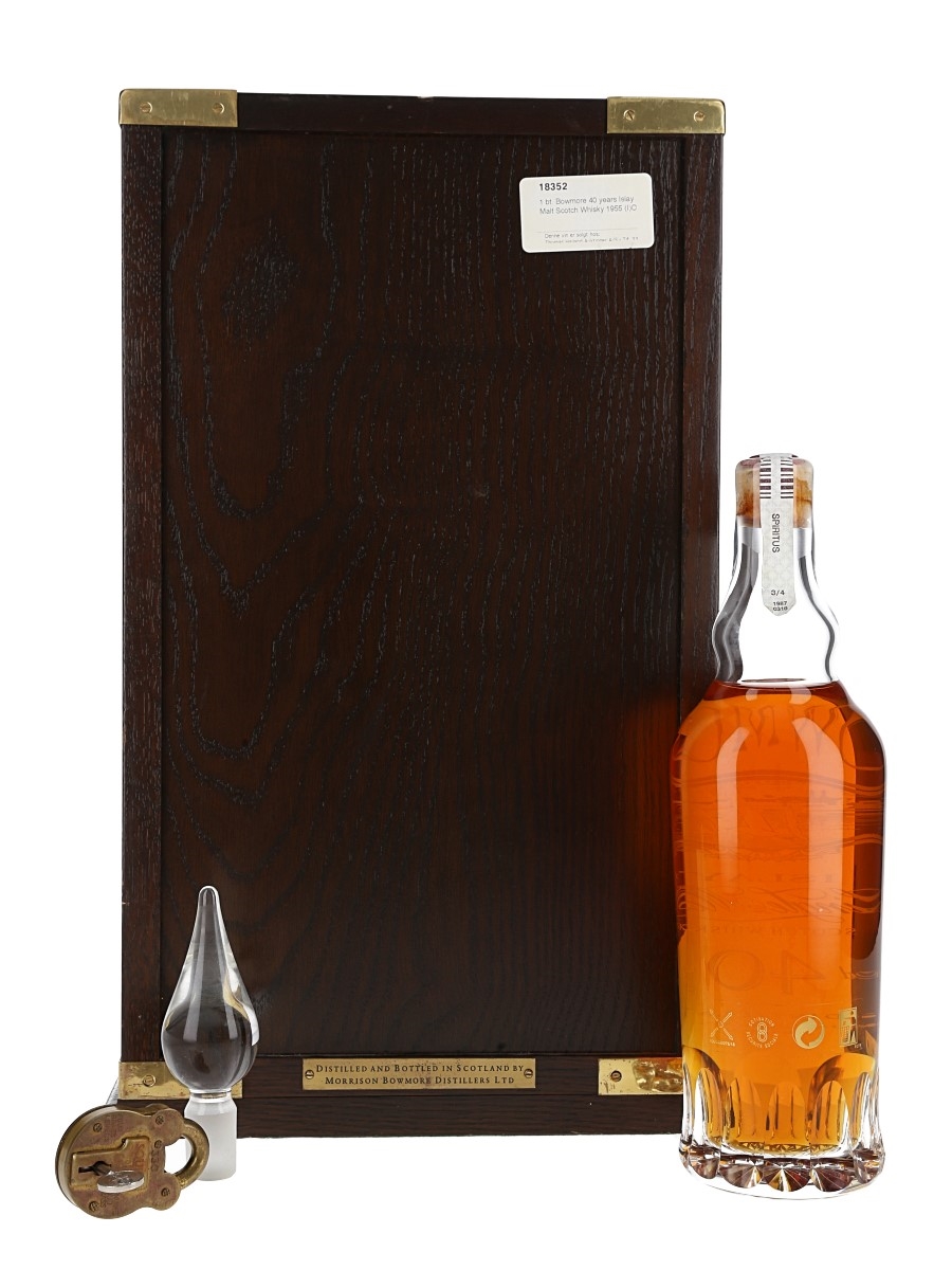 A bottle of Bowmore 40 year old single malt scotch whisky. This was distilled on 22 November 1955 and matured firstly in an ex-bourbon hogshead before being transferred to a sherry butt and bottled in a crystal decanter made by Caithness Glass, while the wooden cabinet was hand-made by Charles Kirkby & Sons. in Sheffield, England.