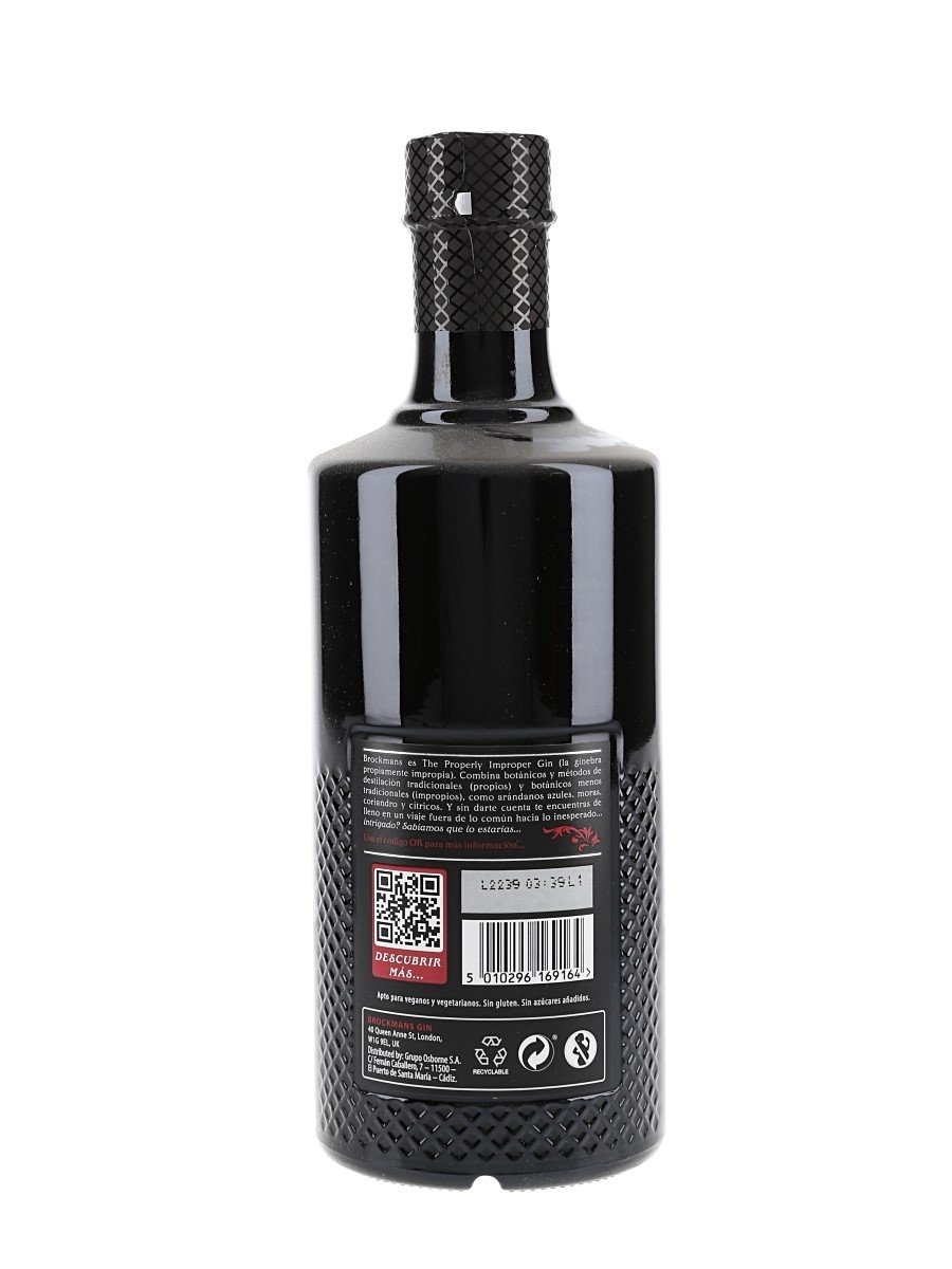 A bottle of Brockmans Premium Gin, distilled in England from neutral grain spirit and infused with botanicals.