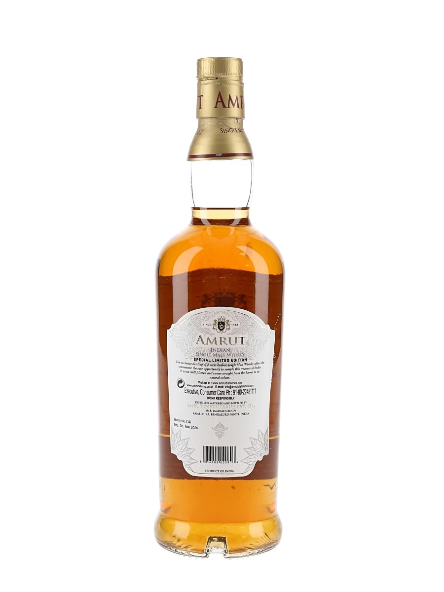 A bottle of Amrut Special Limited Edition single malt whisky from India. This was distilled in August 2014, matured in an Ex-Rum cask and bottled in March 2020.