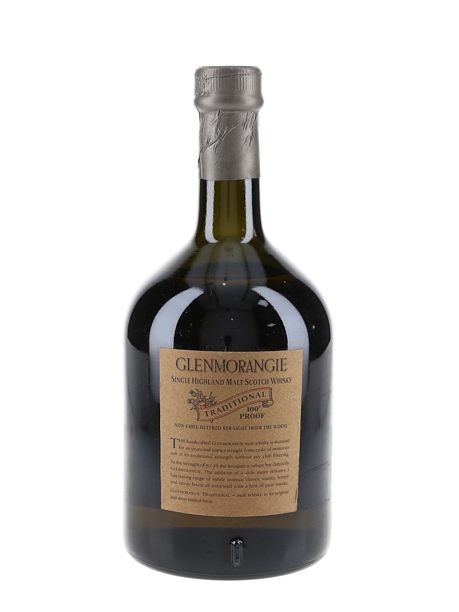 A litre bottle of Glenmorangie Traditional 100° Proof Single Highland Malt Scotch Whisky. This was matured for 10 years before bottling at 57.2% ABV.