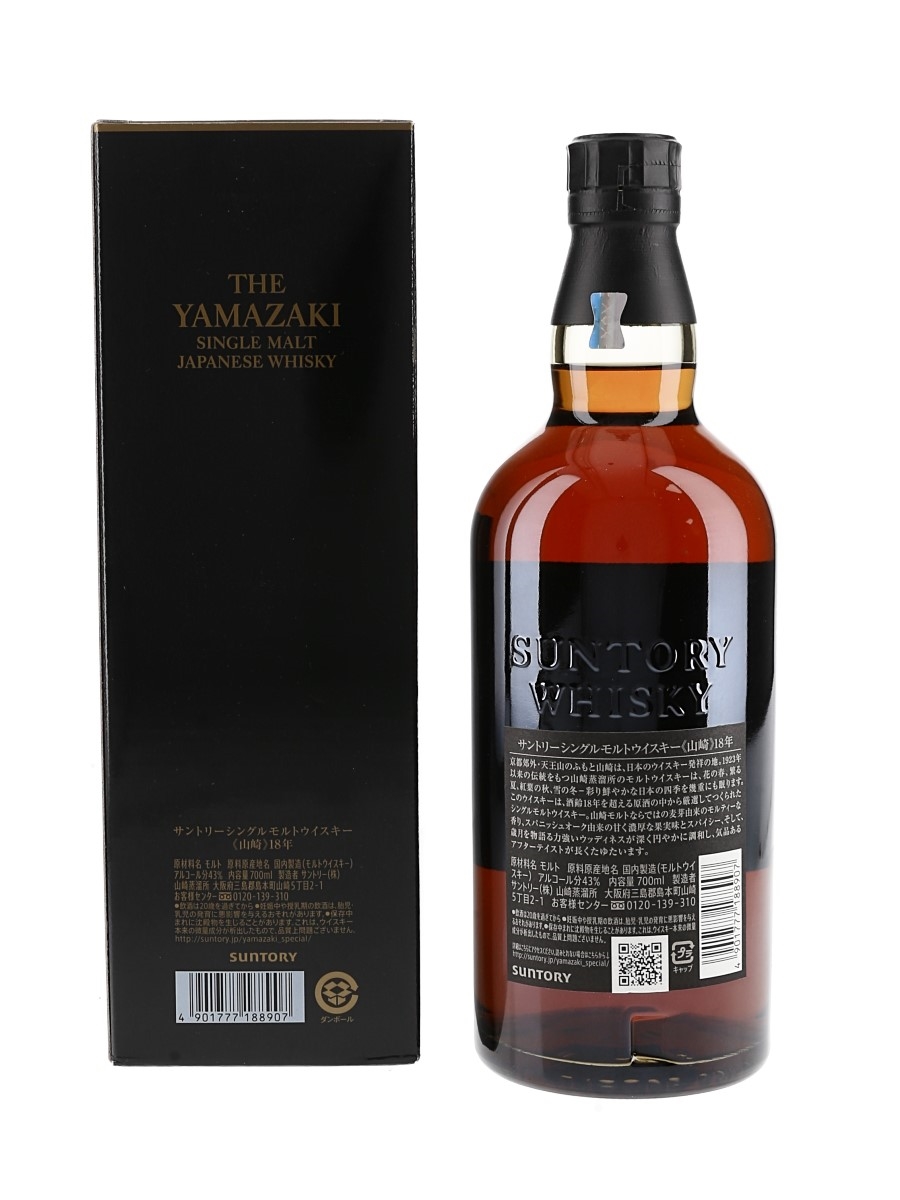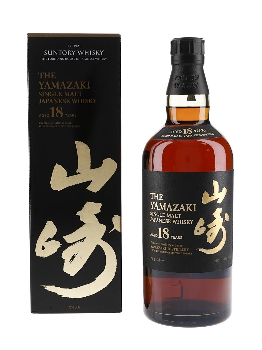 A bottle of The Yamazaki 18 Year Old Single Malt Japanese Whisky, bottled for the Japanese market.