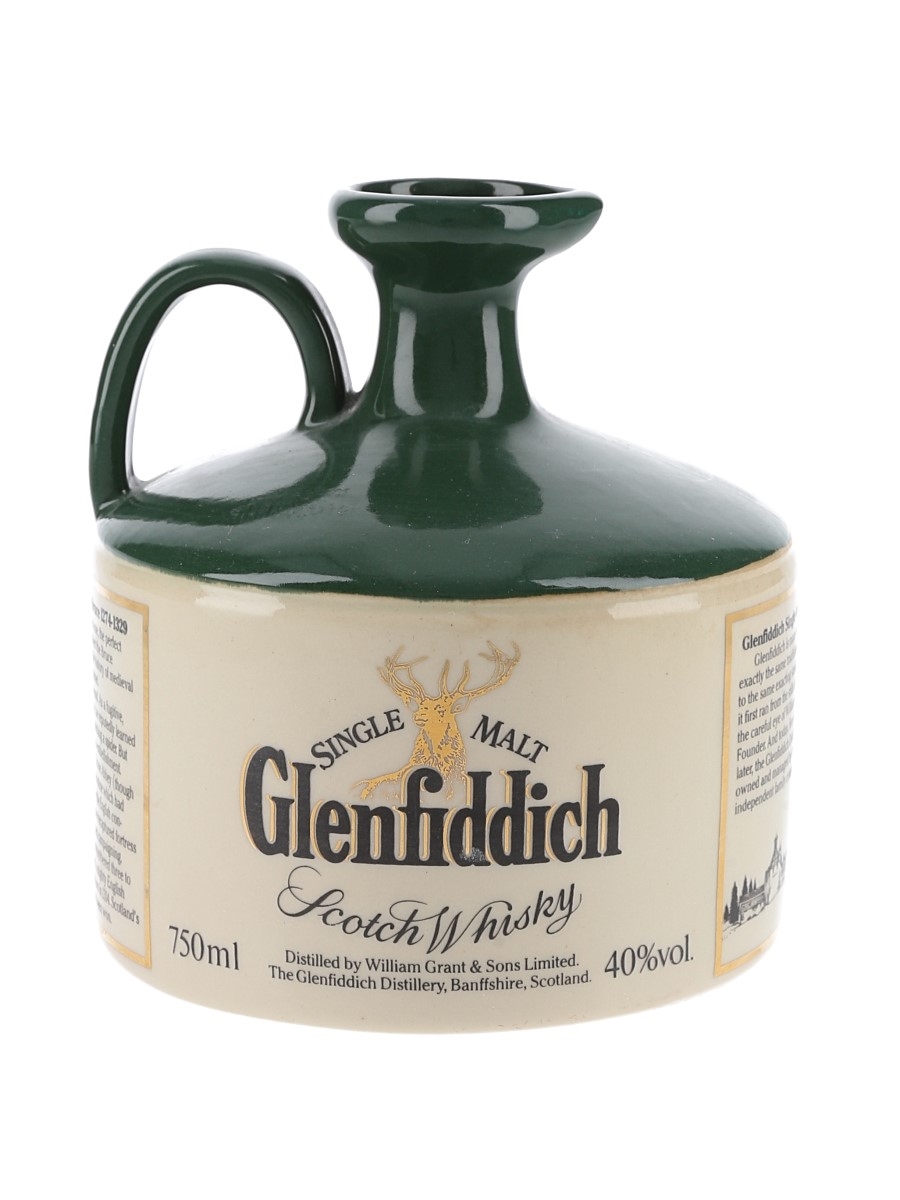 A bottle of Glenfiddich Single Malt Scotch Whisky presented in a ceramic decanter. This was released as part of the Royal Heritage collection and the decanter depicts Robert The Bruce. We estimate this was bottled in the 1980s.