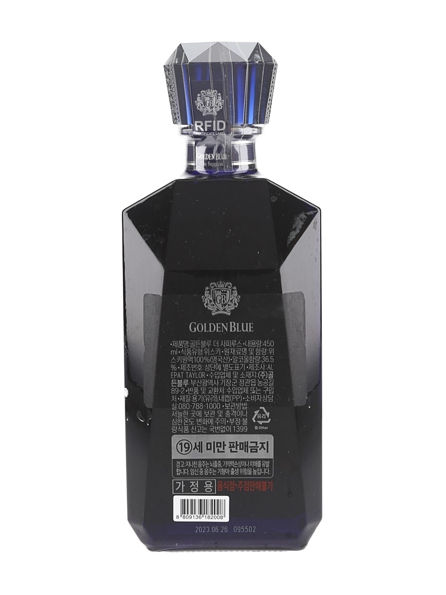A 45cl bottle of Golden Blue The Sappirus Premium Whisky, produced in Korea and bottled at 36.5% ABV. The bottling code indicates this was bottled on 26 June 2023.