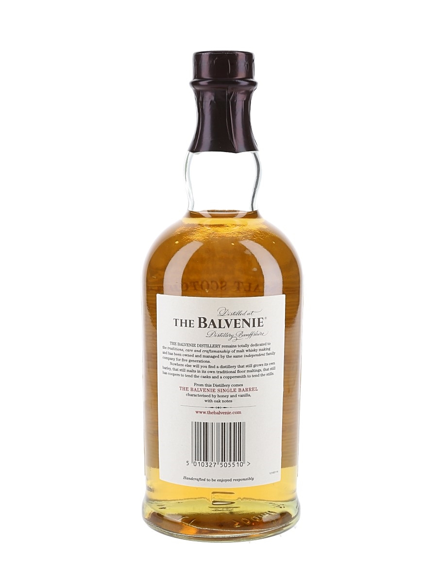 A bottle of Balvenie 15 Year Old Single Barrel Single Malt Scotch Whisky. This was distilled on 16 April 1996, matured in a single barrel and bottled on 13 March 2012.