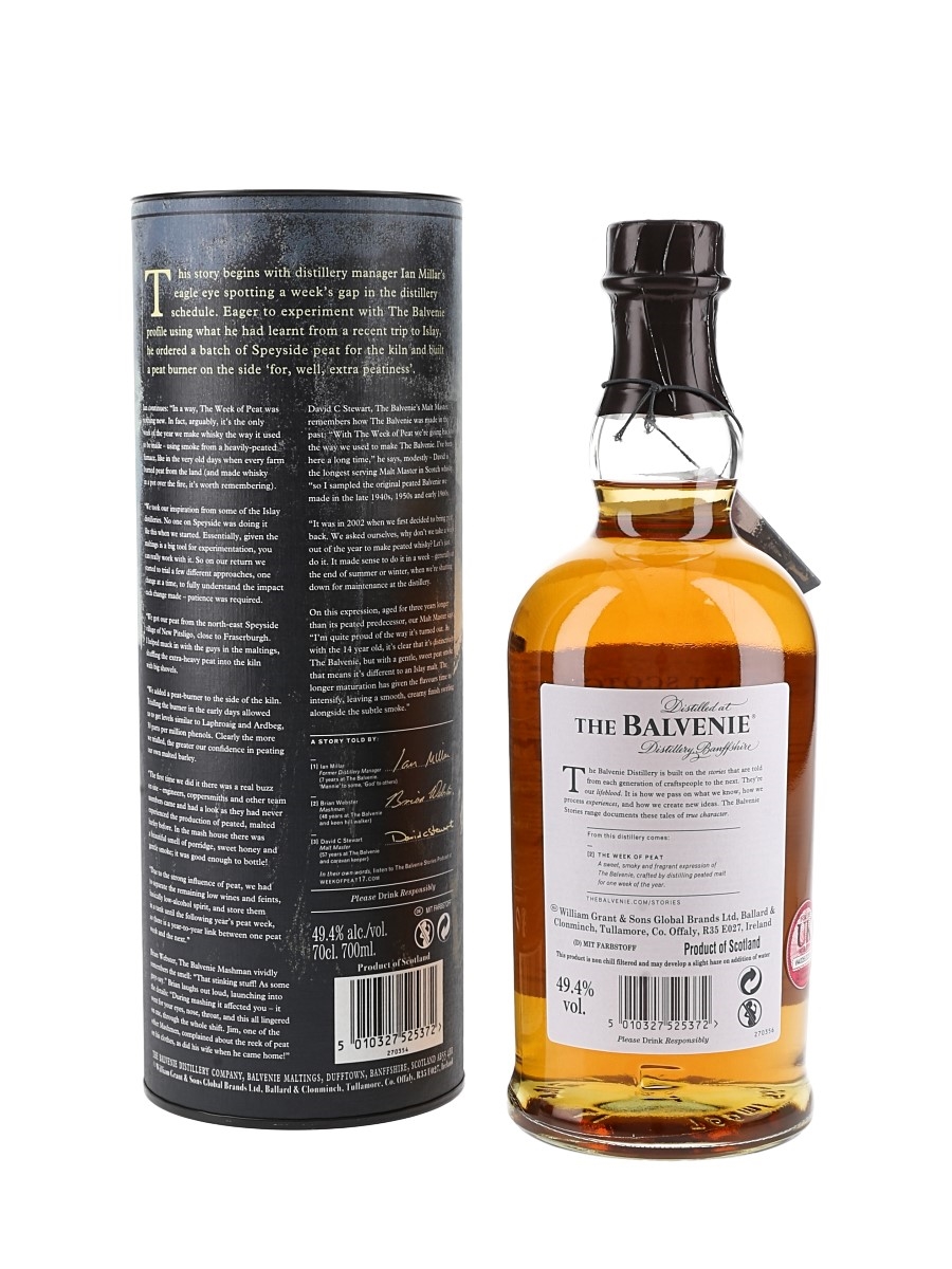 A bottle of The Balvenie 17 Year Old The Week of Peat Single Malt Scotch Whisky, a heavily peated expression inspired by the whisky produced at the distillery in the late 1940s, 1950s and early 1960s. This was bottled at 49.4% ABV as Story No. 2 in The Balvenie Stories series.