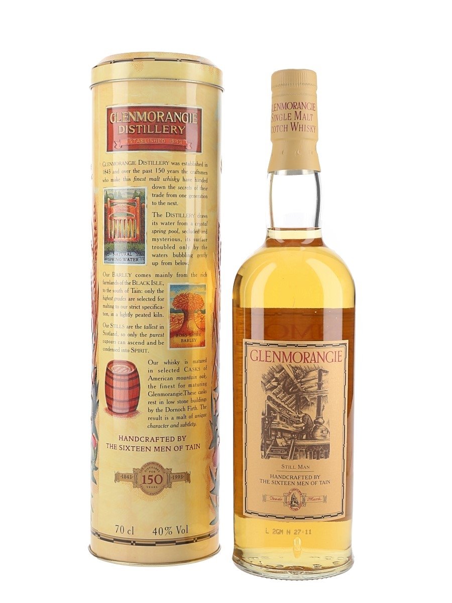 A bottle of Glenmorangie 10 Year Old Single Highland Malt Scotch Whisky. The tin is embossed with an image of the 16 Men of Tain, the makers of Glenmorangie. We estimate this was bottled in the 1990s.