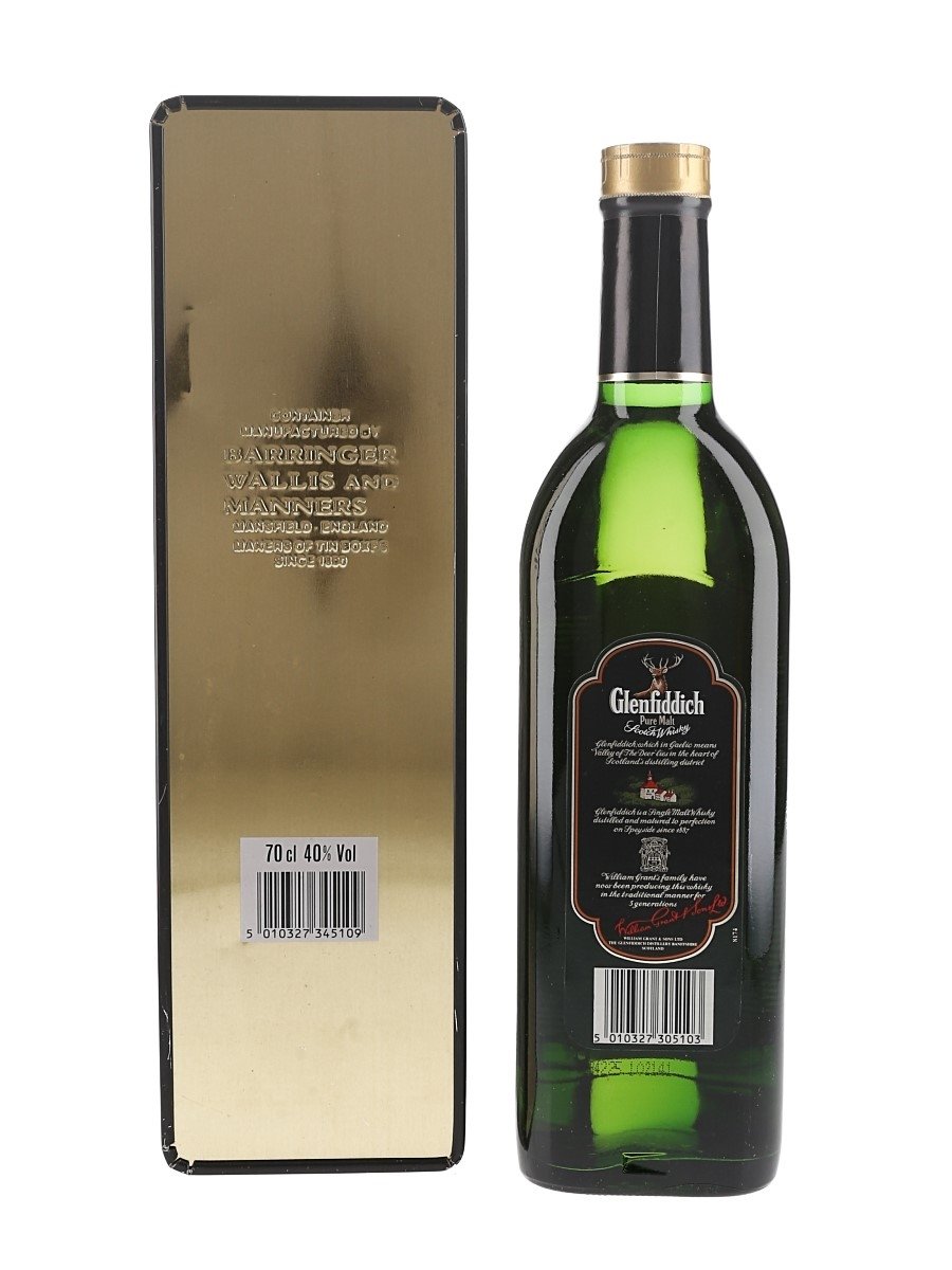 A bottle of Glenfiddich Special Old Reserve Single Pure Malt Scotch Whisky distilled and bottled by William Grant & Sons Ltd and presented in a Clans of the Highlands of Scotland tin.