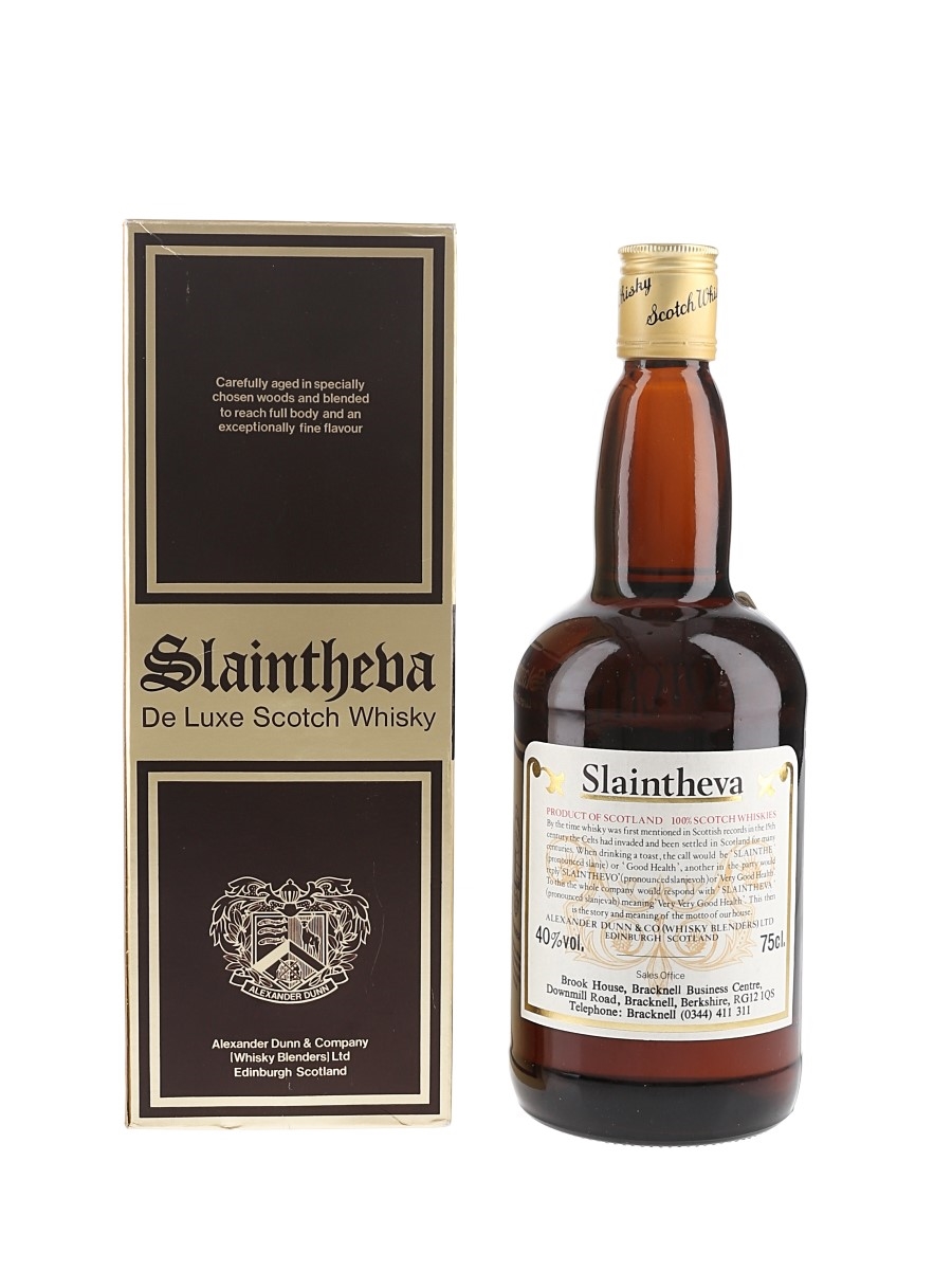 A bottle of Slaintheva 12 Year Old Blended Scotch whisky, bottled by Alexander Dunn & Co. Ltd. This has been personalised for the original buyer.