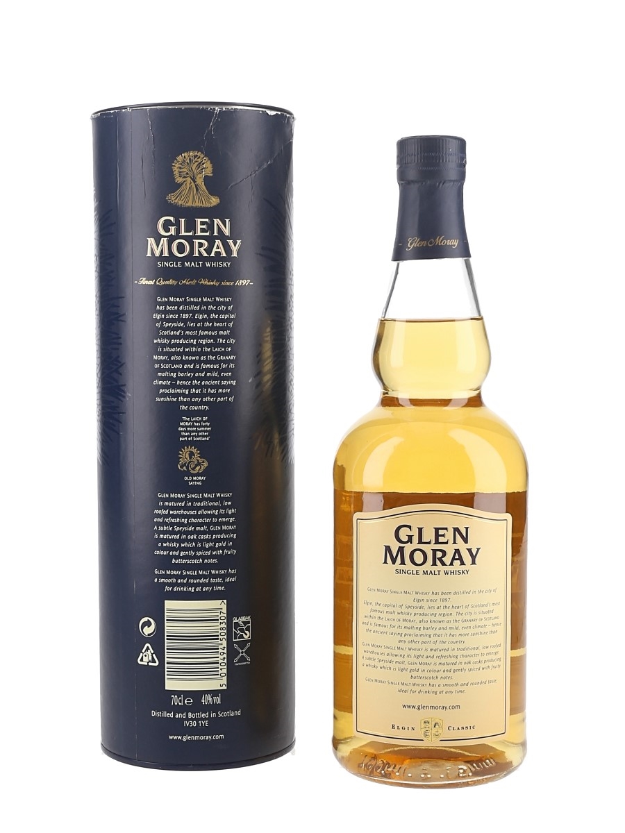A bottle of Glen Moray Classic Single Speyside Malt Scotch Whisky.