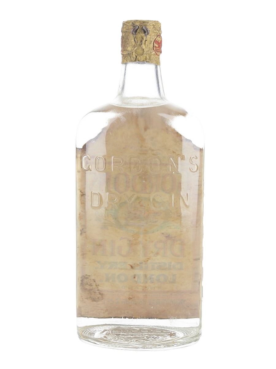 A bottle of Gordon's Dry Gin distilled and bottled in London by Tanqueray, Gordon & Co. Ltd. and sealed with a spring cap closure. We estimate this was bottled in the 1950s to 1960s.