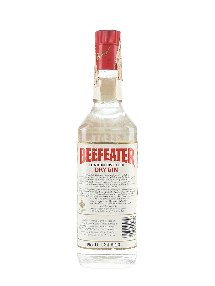 A bottle of Beefeater London Dry Gin, produced and bottled by James Burrough in London England. This was imported to Spain by Pedro Domecq, we estimate in the 1980s.