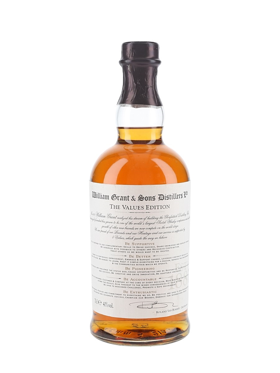 A bottle of William Grant & Sons The Values Edition, a rare release of The Balvenie that was intended for William Grant & Sons' staff. The label lists the values that are considered integral to the company's success.