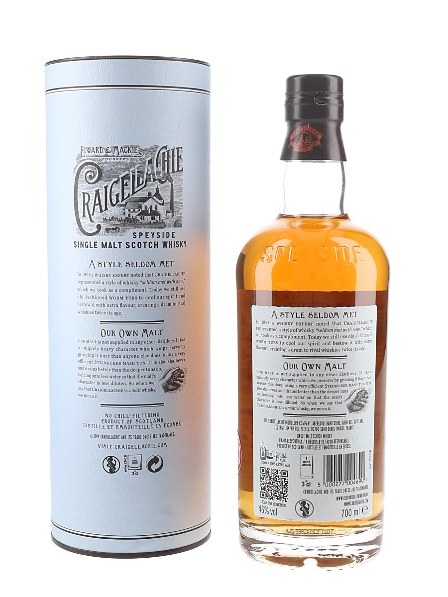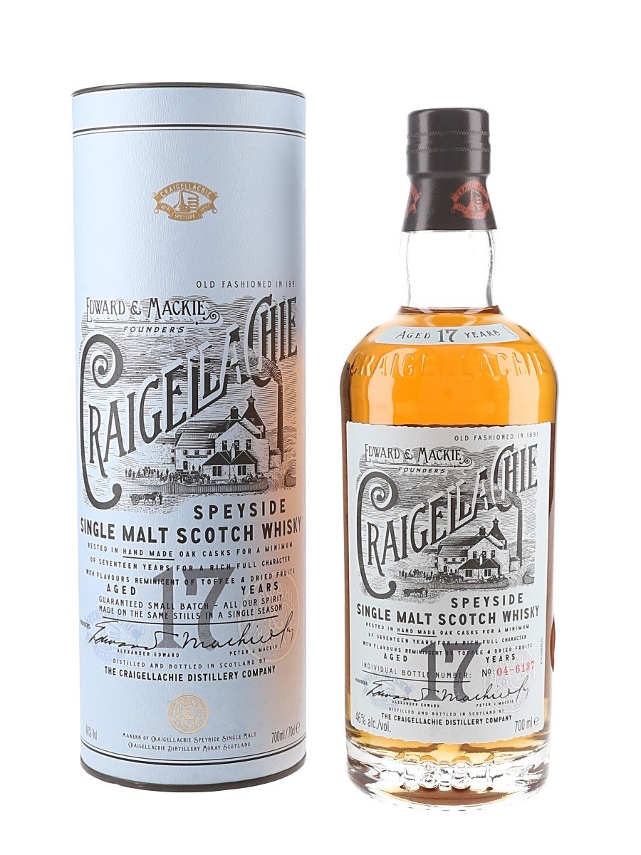A bottle of Craigellachie 17 Year Old Speyside Single Malt Scotch Whisky. This was initially matured in a mix of ex-bourbon and ex-sherry casks, before half of the mix is finished in first-fill sherry casks and the rest in first-fill bourbon casks