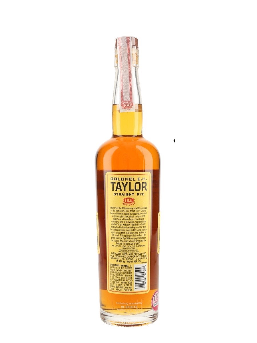 A bottle of Colonel E H Taylor Straight Kentucky Rye Whisky, distilled by Old Fashioned Cooper distillery and bottled in bond at 100 proof (50% ABV). The bottling code indicates this was bottled in 2019.
