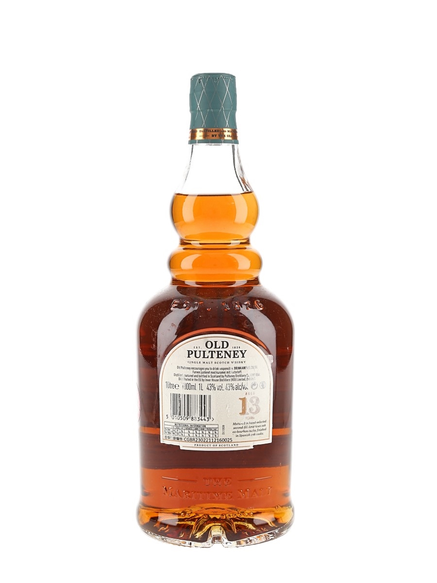 A litre bottle of Old Pulteney 13 year old Single Malt Scotch Whisky. This was matured in Second Fill American Oak Ex-Bourbon and finishin Spanish Oak cask and bottled in 2023 for Traveller's Exclusive.