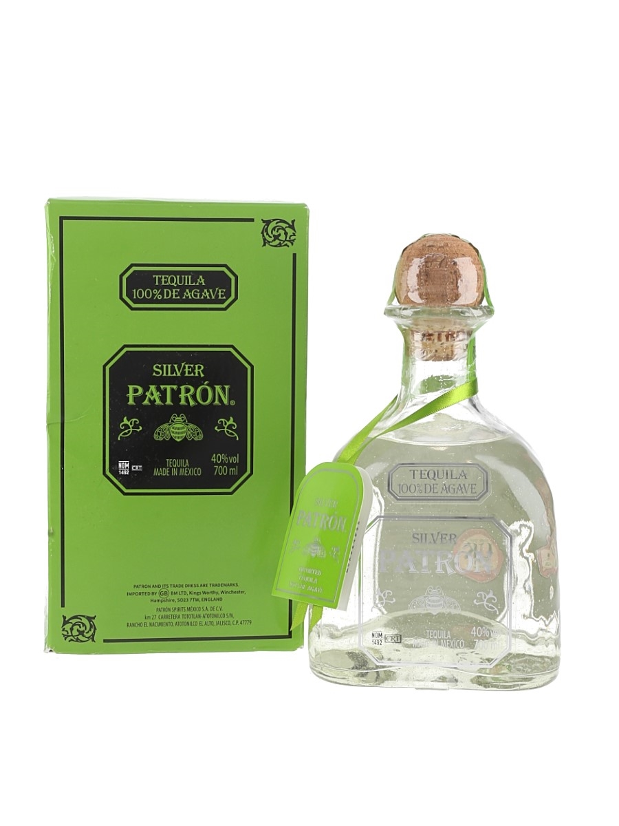 A bottle of Patron Silver premium blanco tequila from one of the most famous houses in Mexico. The agave is selected for its high sugar content, steamed, crushed, fermented and distilled using traditional techniques. This Tequila is triple distilled, and matured in oak casks for a short time before filtering to remove the colour obtained from the cask. Each bottle is hand-polished.