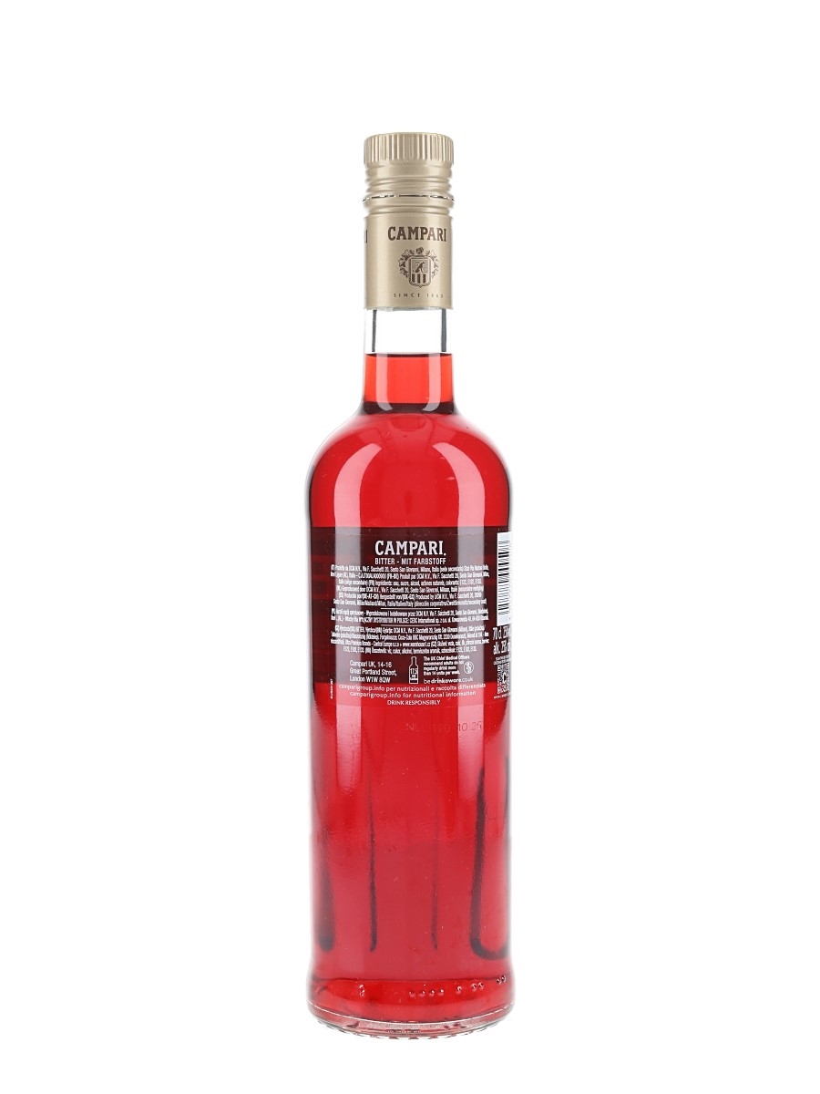 A bottle of Campari Bitter liqueur. Campari was invented in a Milan coffee shop by Gaspare Campari in 1860. It is a bitter liqueur flavoured with 68 herbs, fruits and spices.